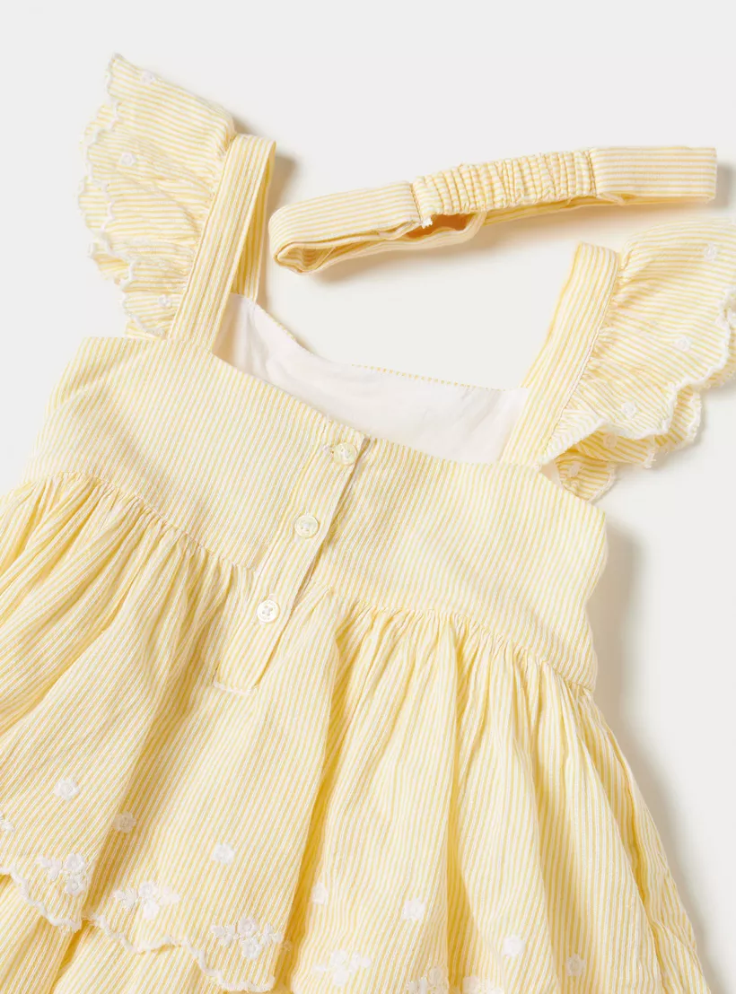 This floral embroidered dress with a matching hairband is perfect for your little princess. The dress is sleeveless and has a tiered design with a square neck. It is made from soft cotton for a breathable and comfortable feel.