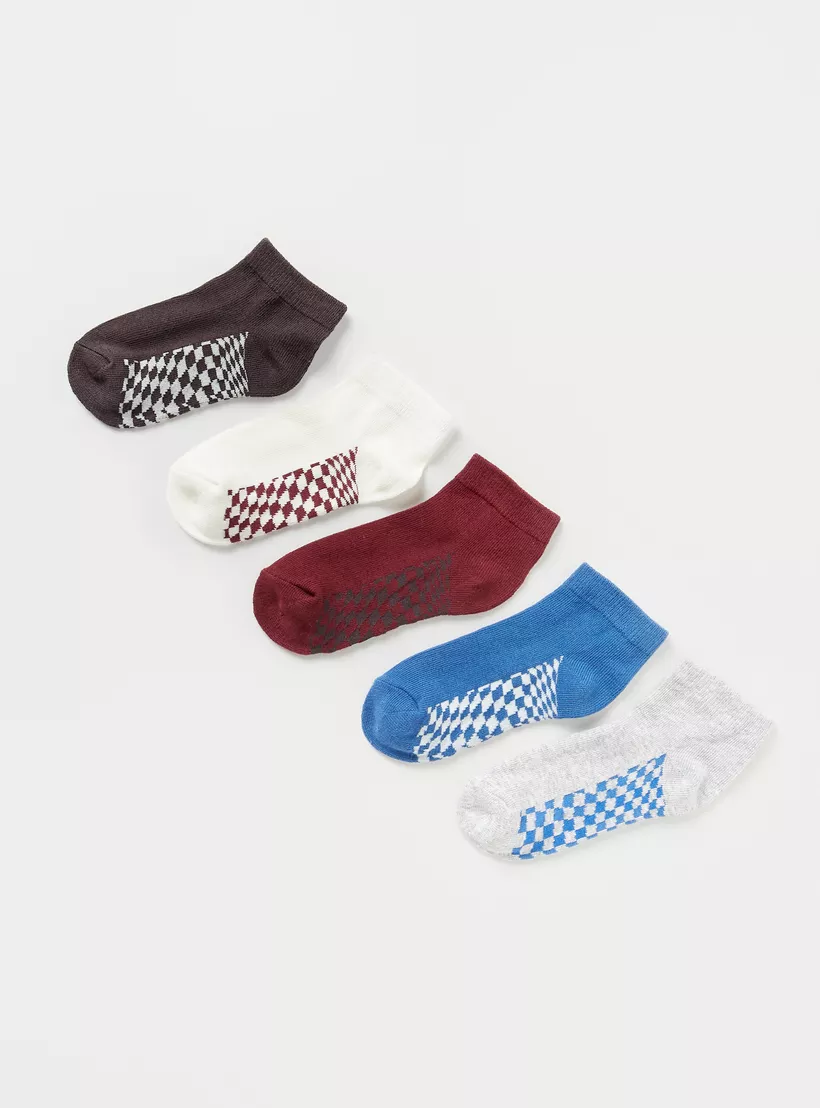 The Gloo Checked Ankle Length Socks – Set of 5 are a stylish and practical addition to any young boy’s wardrobe. Crafted from a soft cotton blend, these socks offer both comfort and durability, making them suitable for everyday wear.