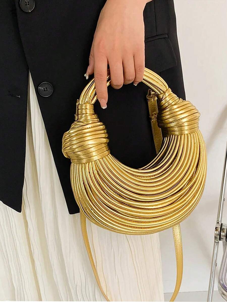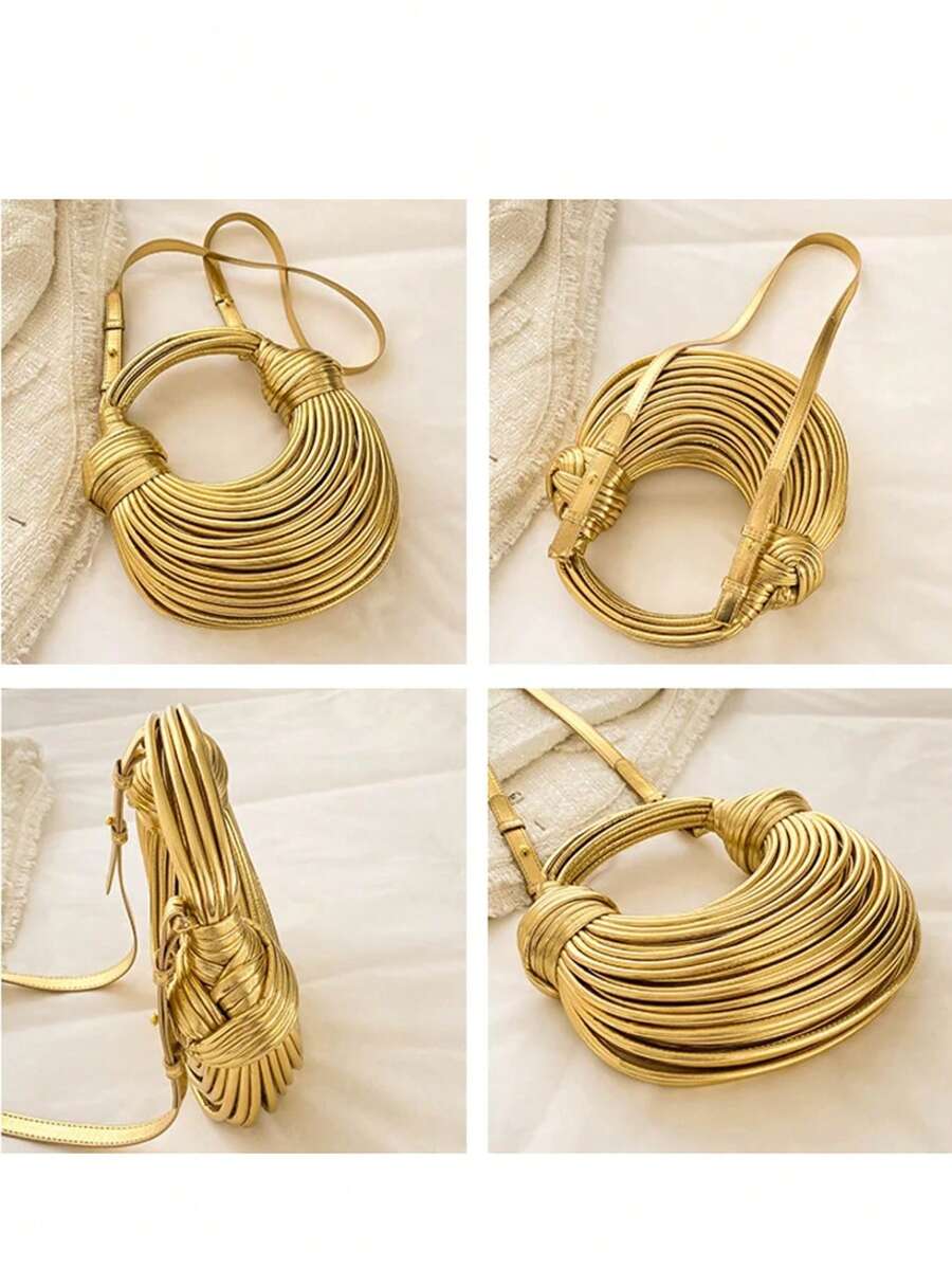 Elevate your style with the New Gold Luxury Designer Handwoven Noodle Bag—a perfect blend of elegance and craftsmanship. Designed for fashion-forward women, this rope-knotted hobo clutch boasts a stunning gold finish and an intricate handwoven design, making it a standout piece for any occasion.