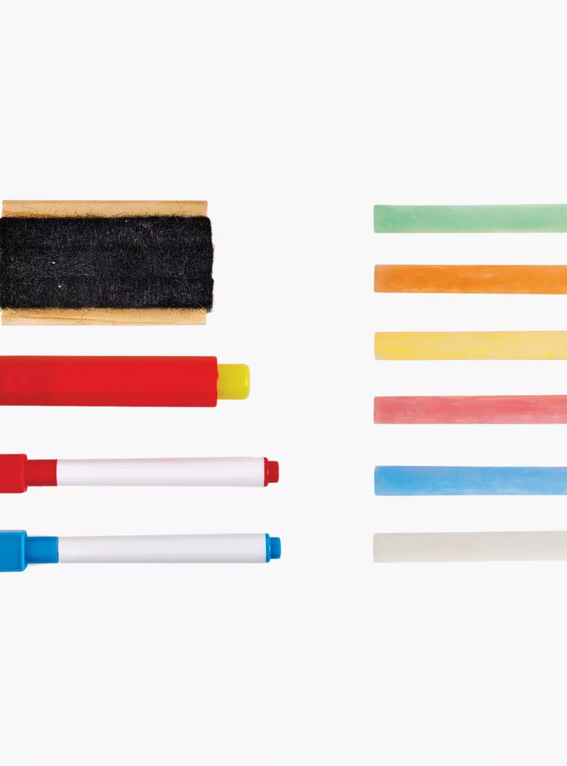 • Double-Sided Design: One side is a traditional chalkboard, the other a magnetic whiteboard, perfect for versatile learning and play.