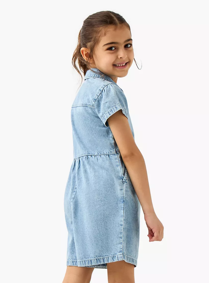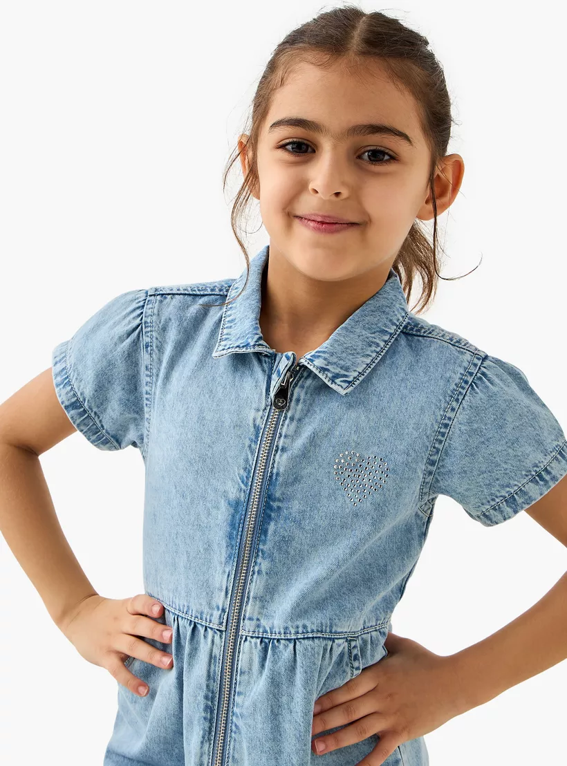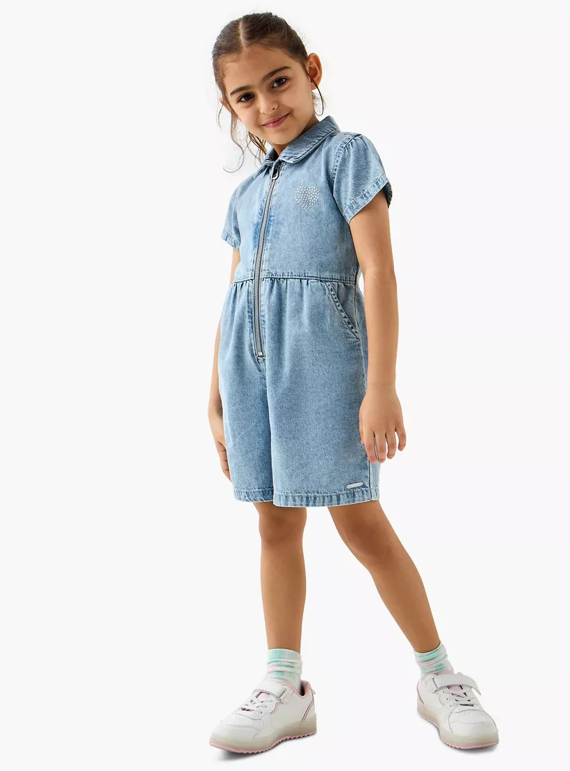 Heart Embellished Denim Romper with Short Sleeves and Zip Closure