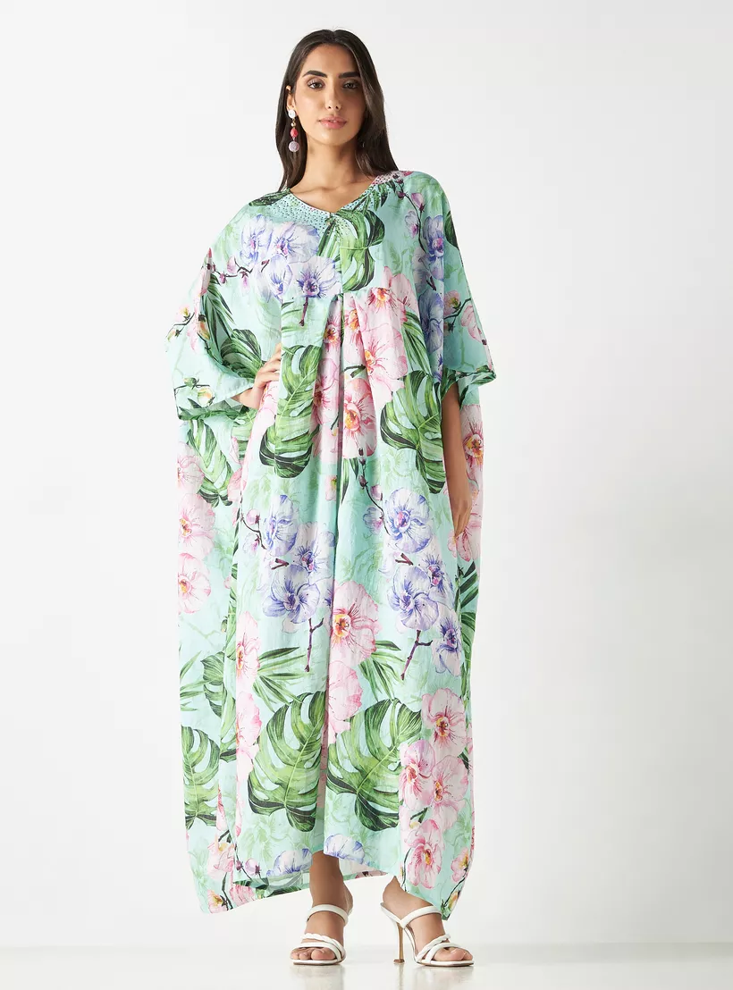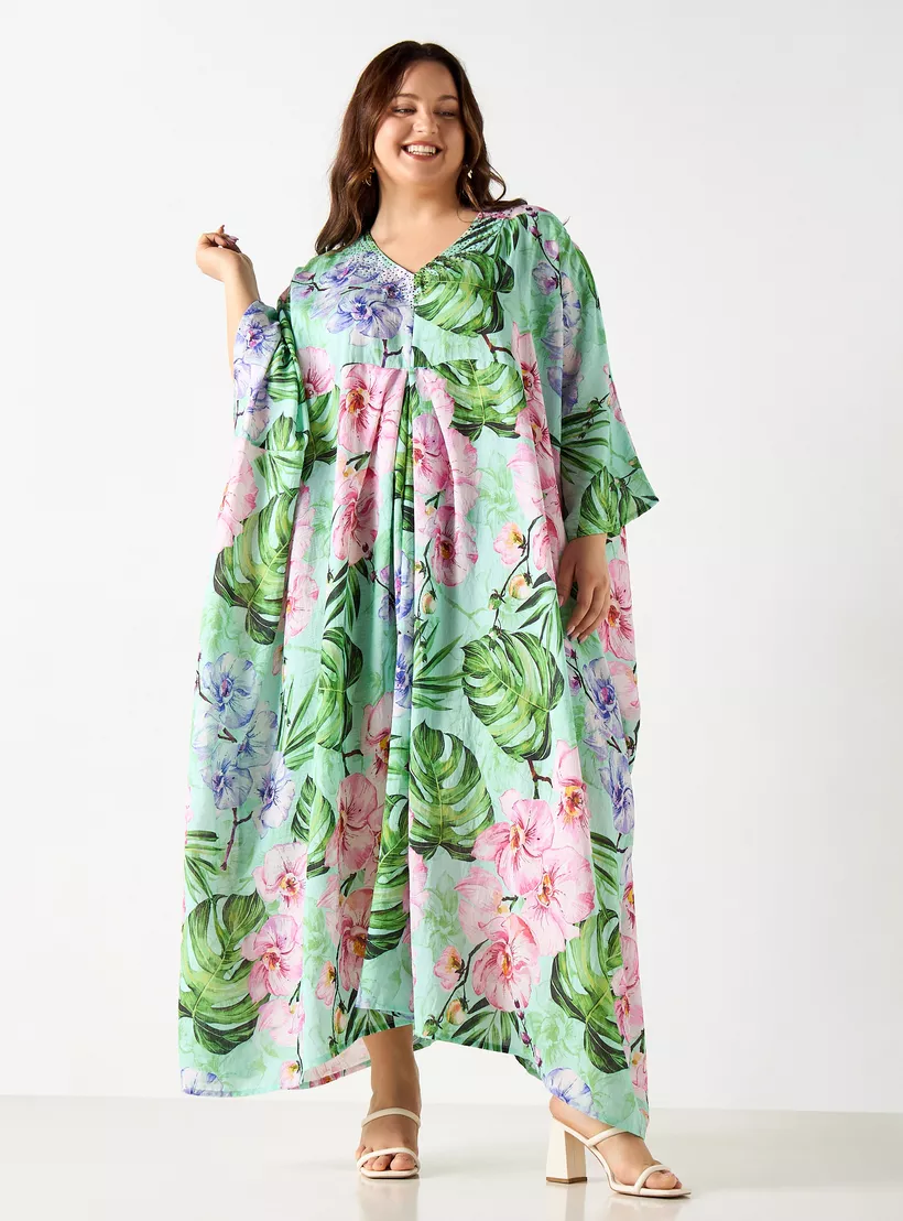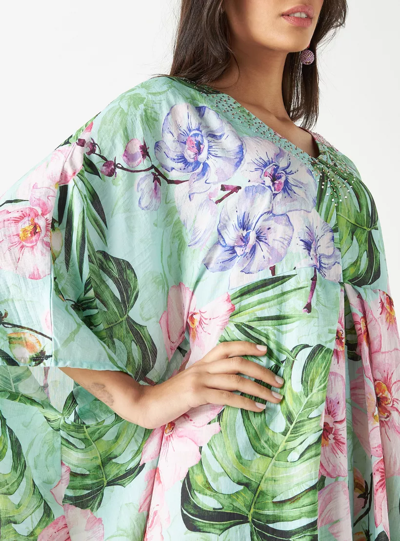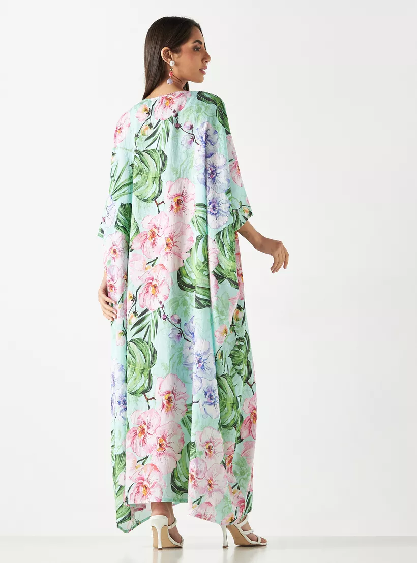 Iconic All-Over Tropical Print Kaftan Dress with V-neck