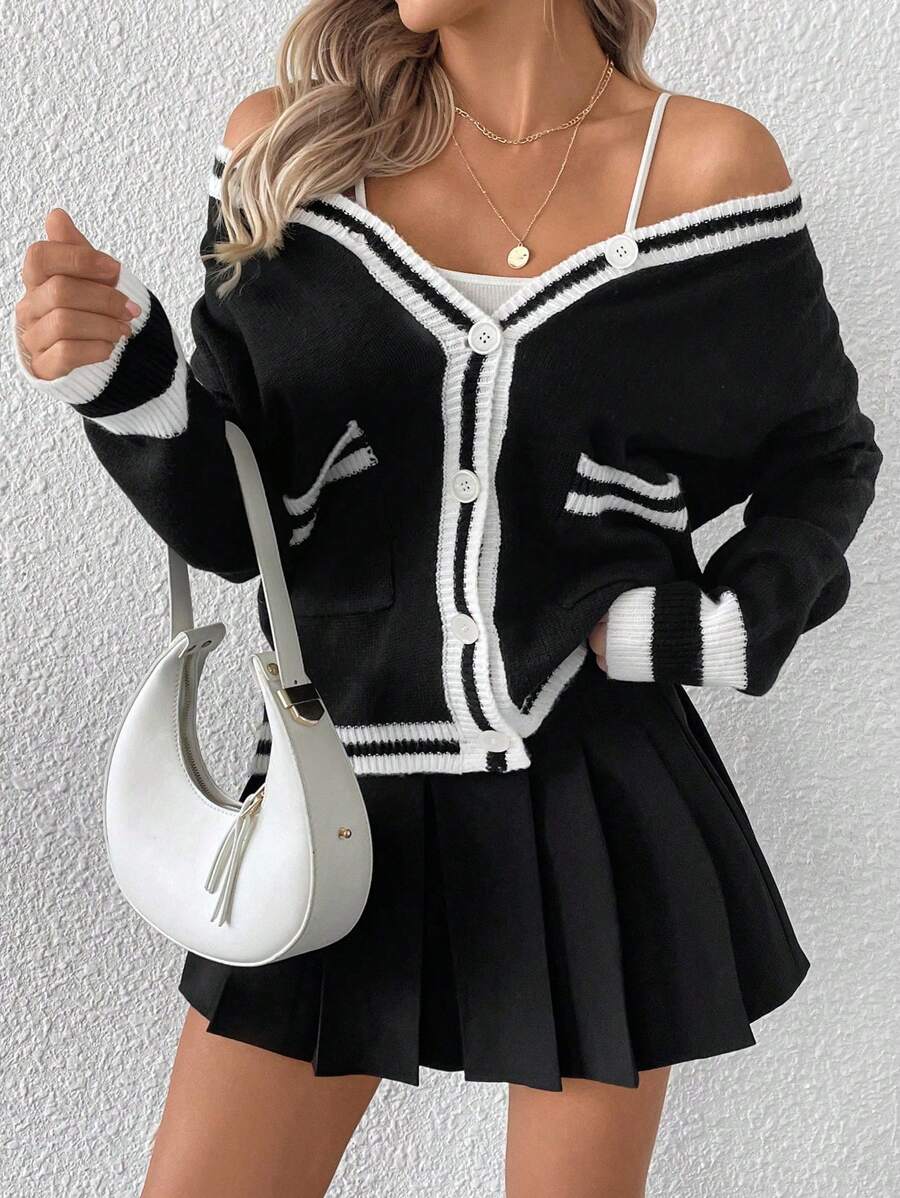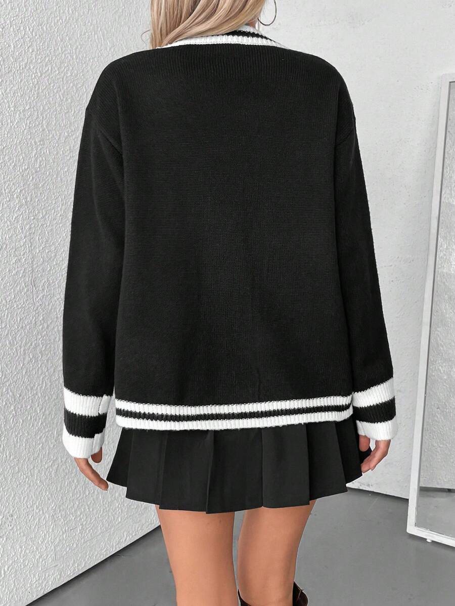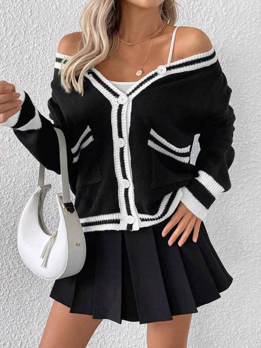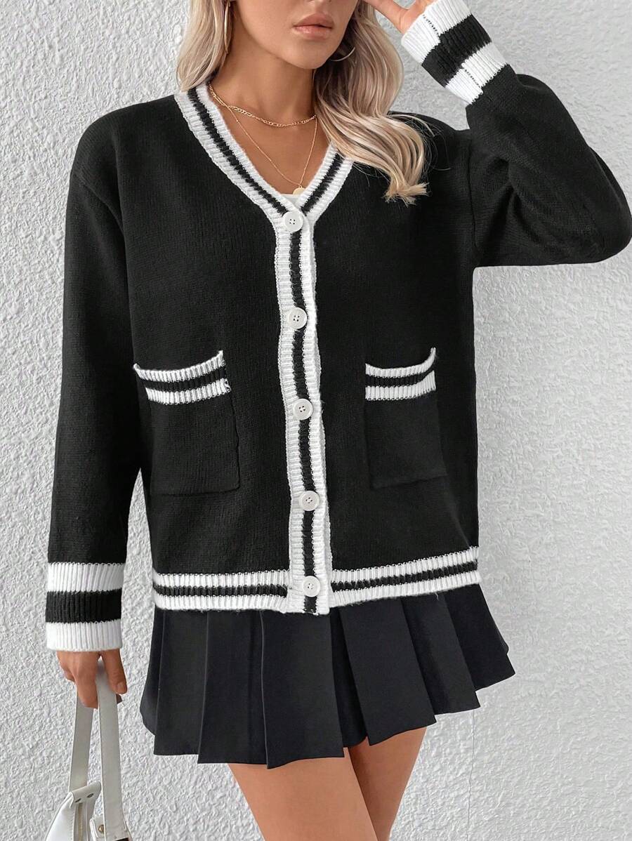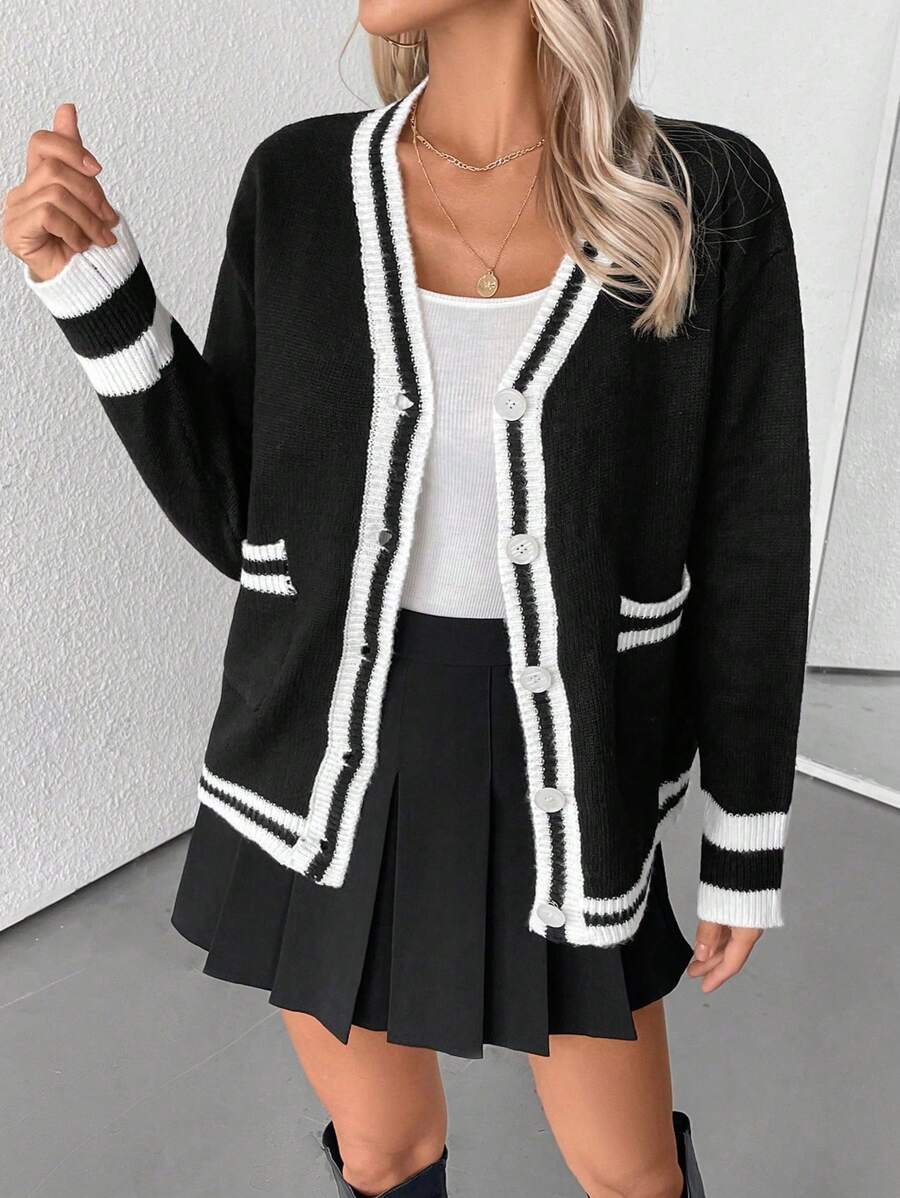 INAWLY 1pc Women V-Neck Color Block Trim Front Button Cardigan, Long Sleeve