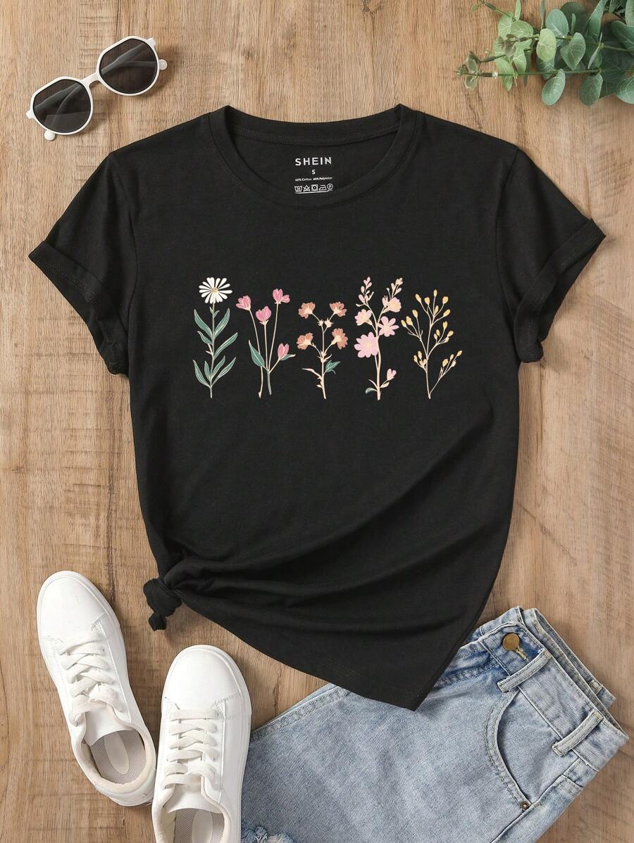 INAWLY Women's Floral Print Round Neck T-Shirt Graphic Tees Women Tops quantity