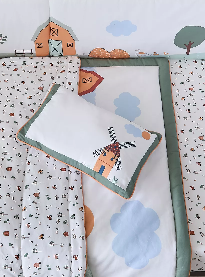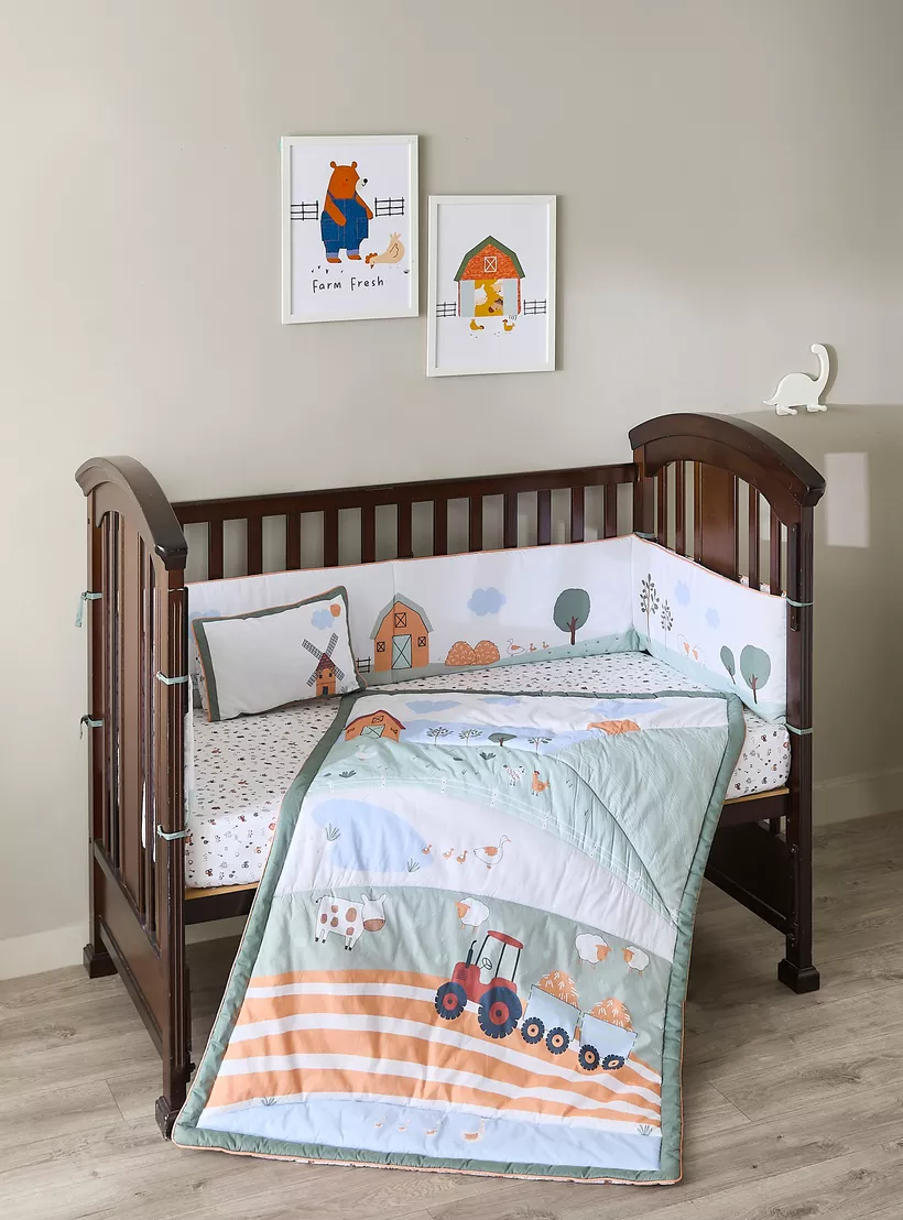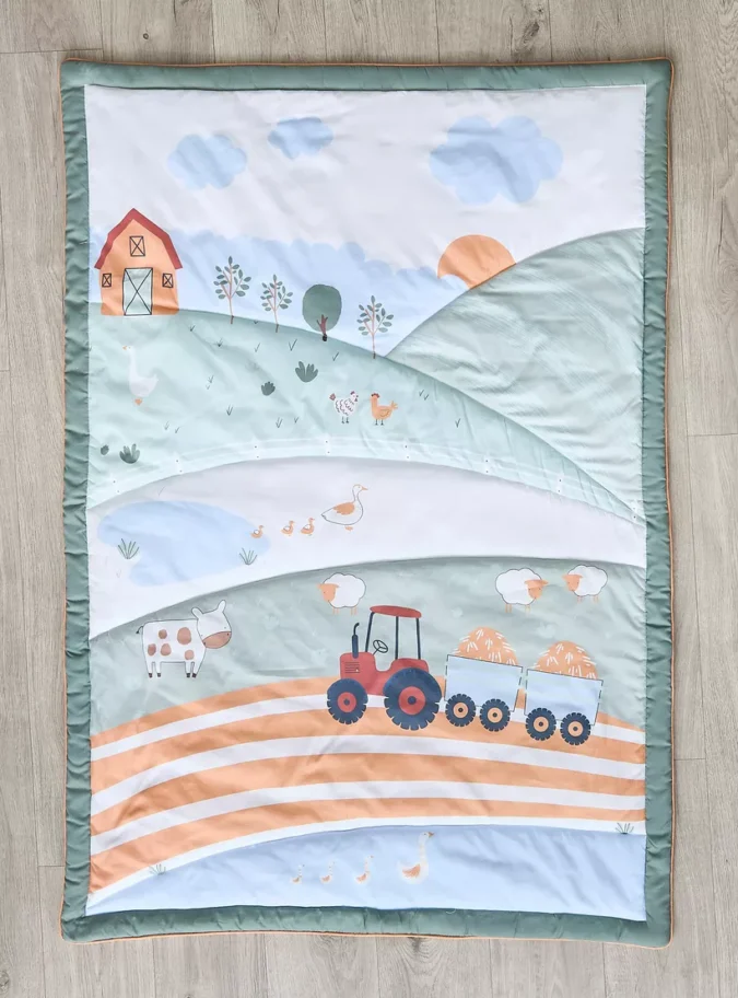 Vibrant Farmyard Print: Features cheerful illustrations of friendly animals (like cows, pigs, chickens, and sheep), barns, tractors, and countryside scenery.