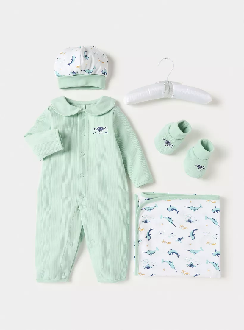 Dress your little adventurer in style with this five-piece apparel set. Featuring a charming underwater print, this set is perfect for any occasion. Made from soft and breathable cotton, your baby boy will stay comfortable all day long. Mix and match the pieces to create endless outfit possibilities.