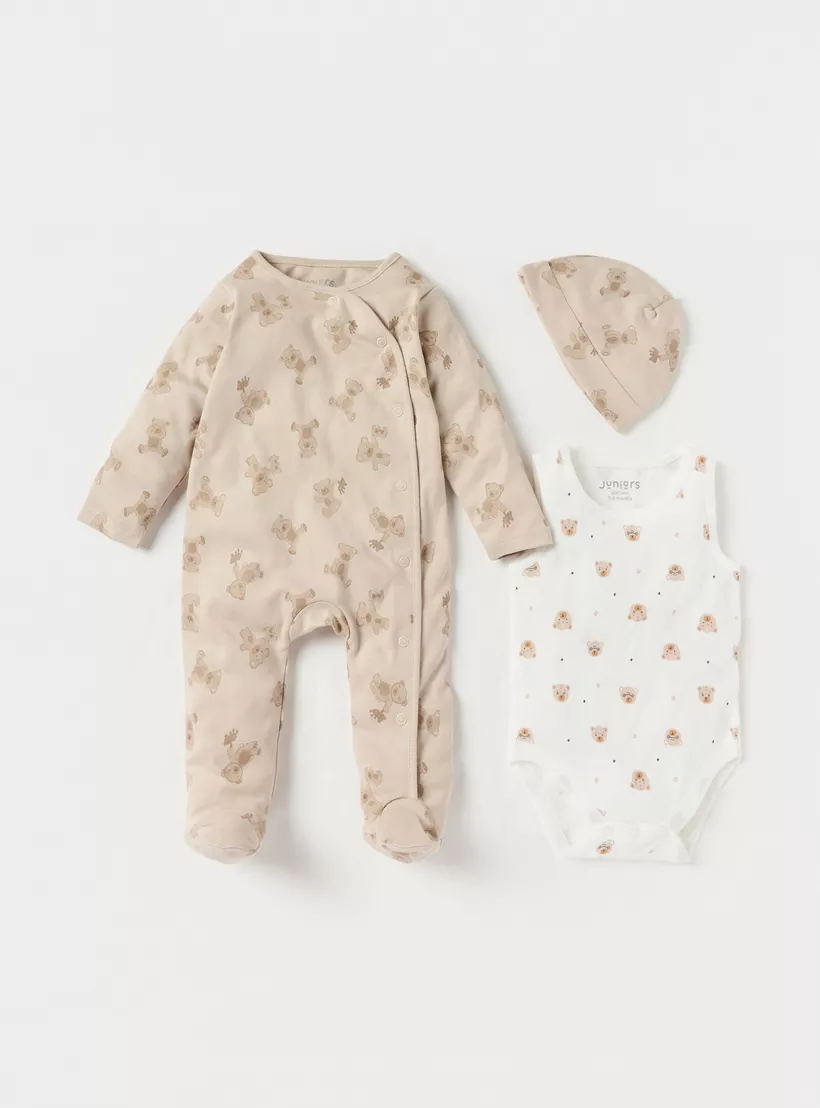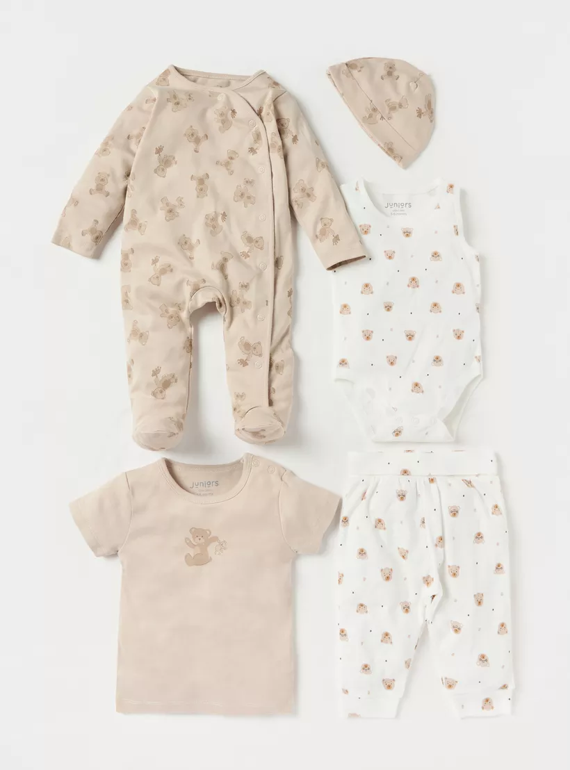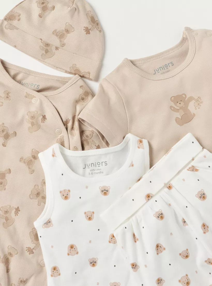 This adorable six-piece clothing set is apt for a newborn baby boy. It includes a closed-feet sleepsuit, a sleeveless bodysuit, a T-shirt, a pair of pyjamas, a beanie and a hanger bag. These pieces are delighted by a teddy bear print and crafted from breathable, soft cotton fabric. This set is a thoughtful gift.