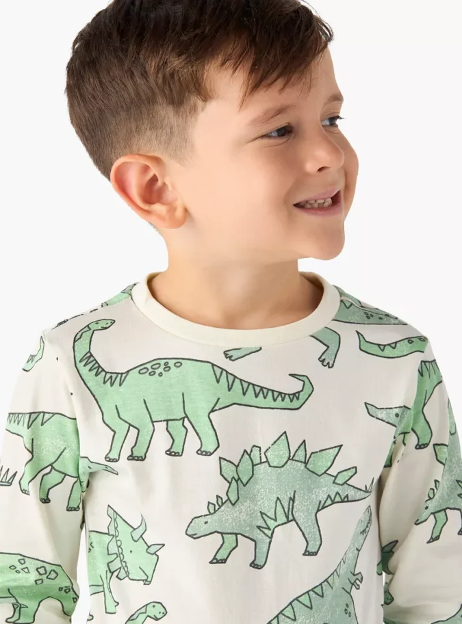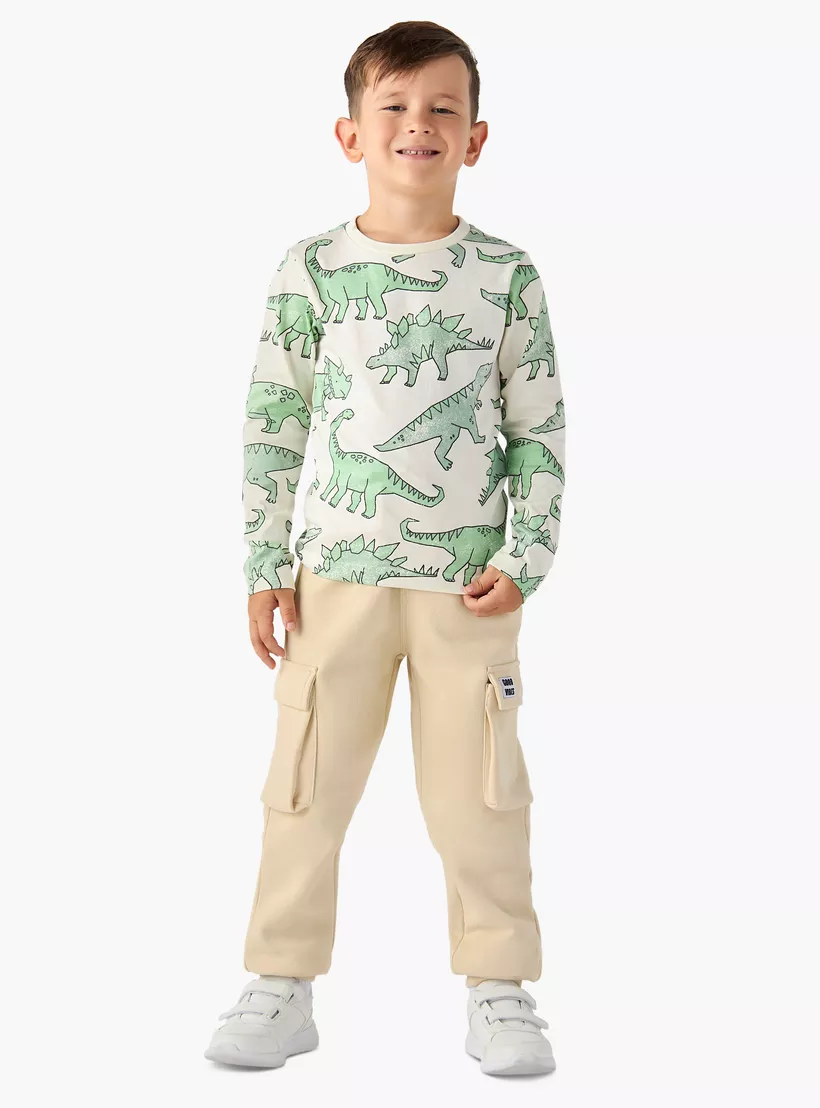 Fun Dino Print: Features an all-over dinosaur graphic design for a playful and adventurous look.