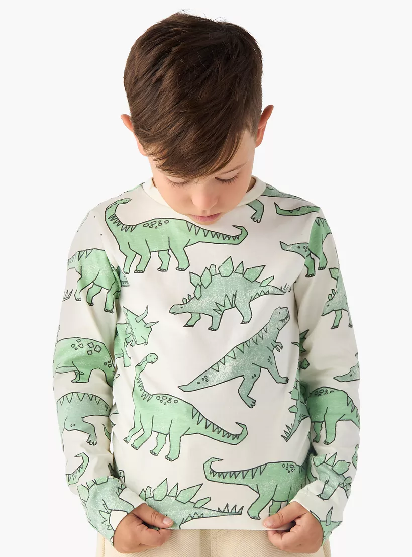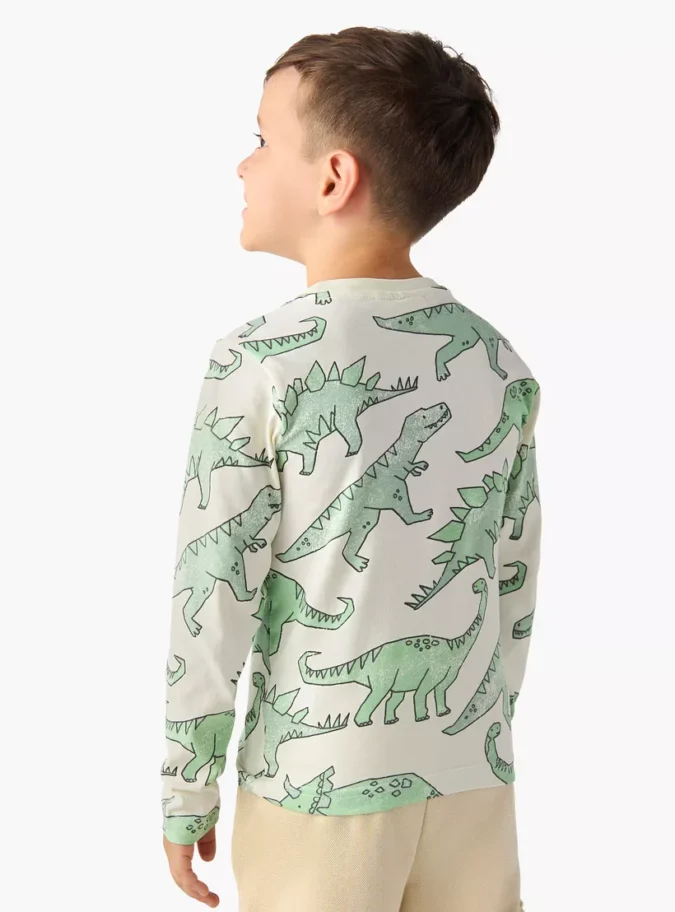 Juniors All-Over Dino Print Crew Neck T-shirt with Long Sleeves