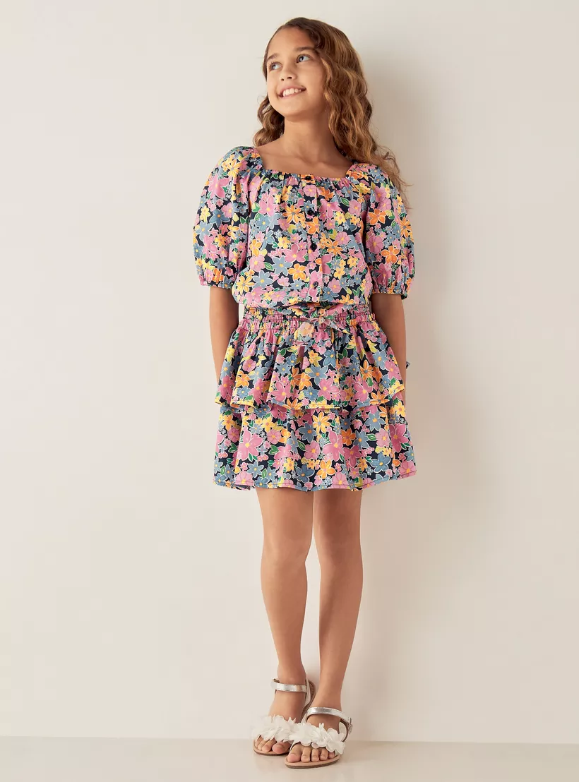 Juniors All-Over Floral Print Square Neck Top and Tiered Skirt Set