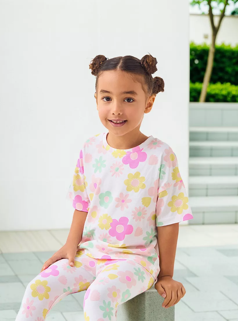 Juniors All-Over Flower Print T-shirt with Drop Shoulder Sleeves