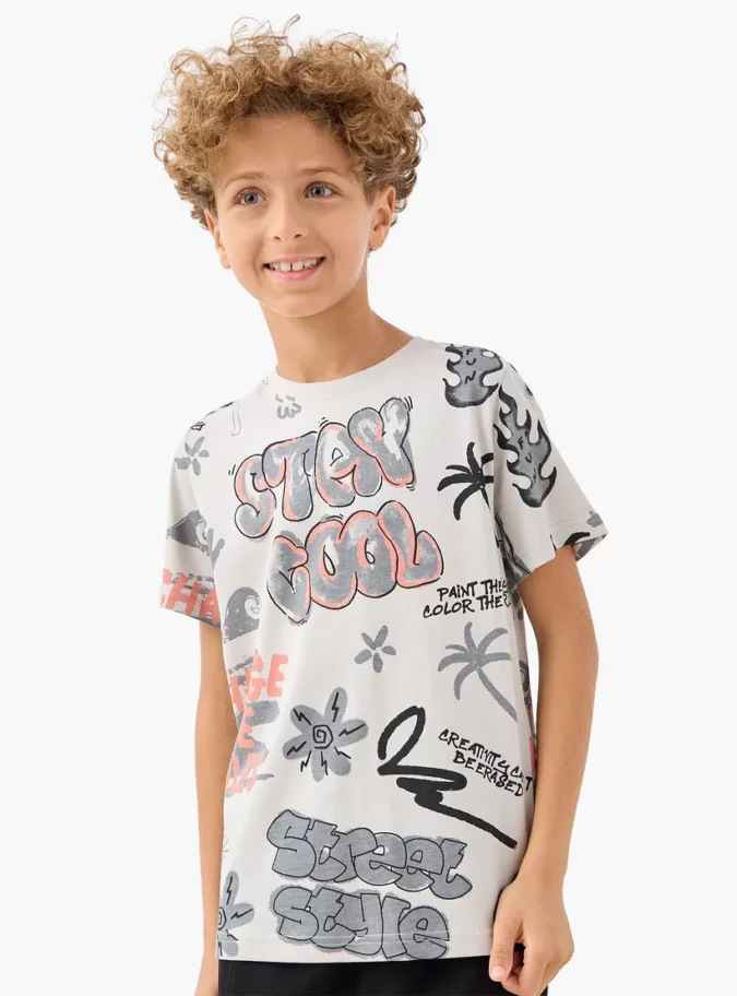 Juniors All-Over Print Crew Neck T-shirt with Short Sleeves