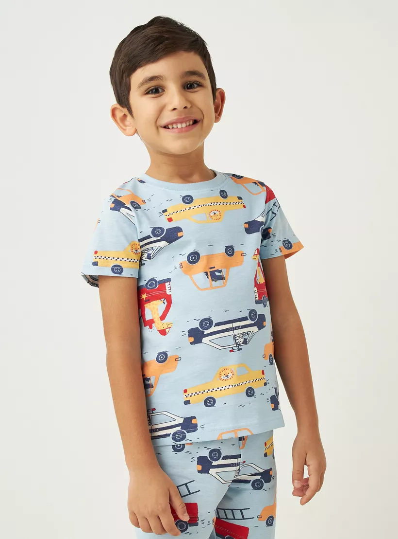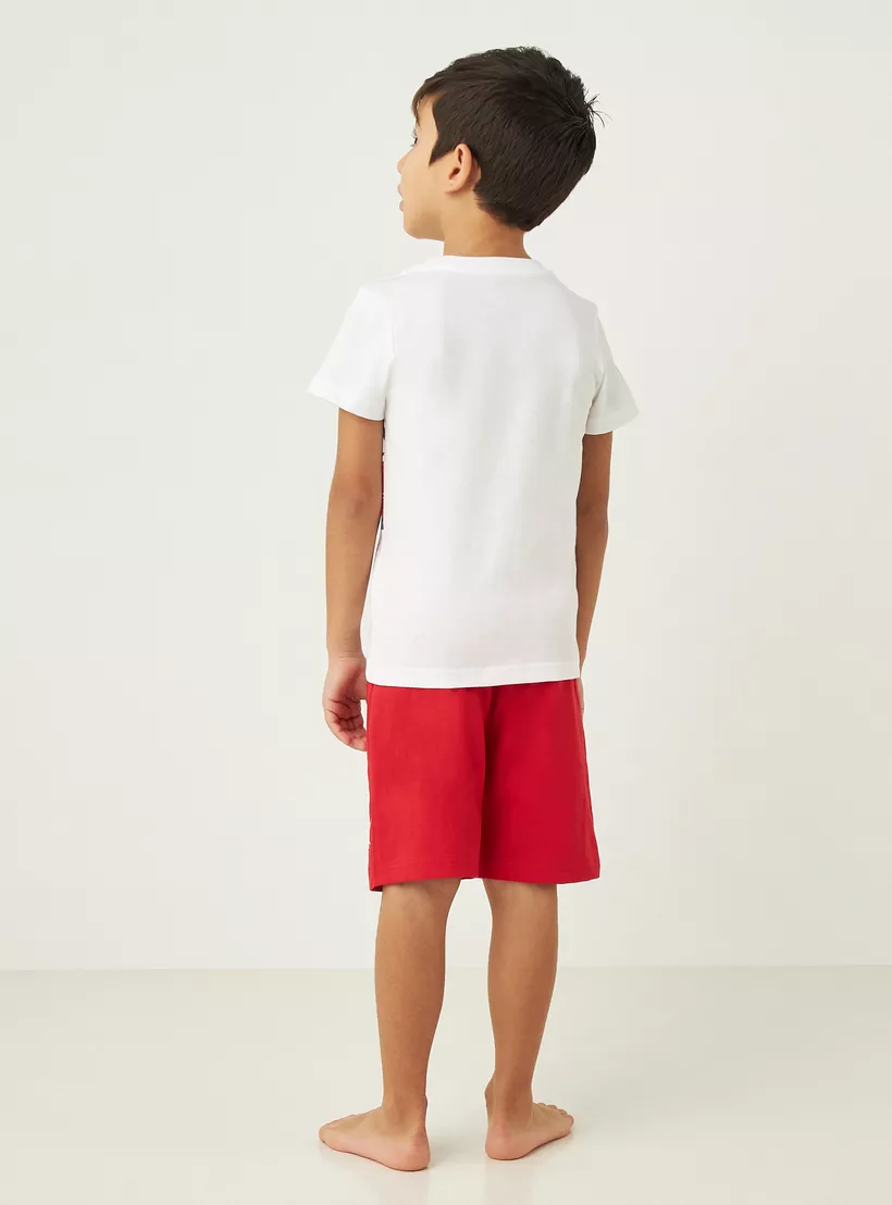 This striking pyjama and shorts set is a summer essential for young boys. With its eye-catching printed design, it will make bedtime fun and exciting. The set includes a comfortable pyjama, shorts and a matching T-shirt, both made from breathable cotton for a restful night’s sleep.