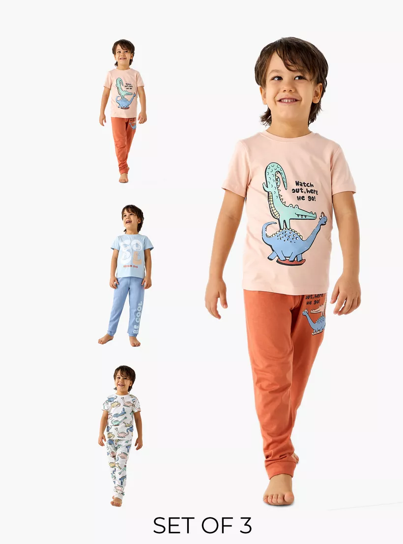 Juniors Dino Print T-shirt with Pyjama – Set of 3
