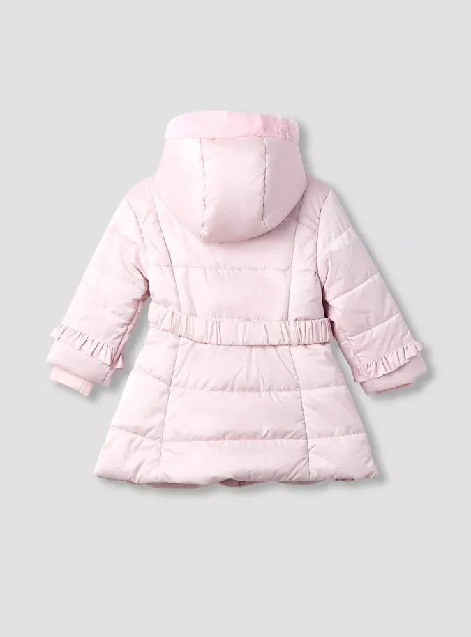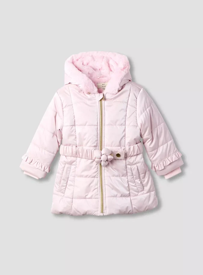 Juniors Floral Accent Hooded Puffer Jacket with Long Sleeves and Belt