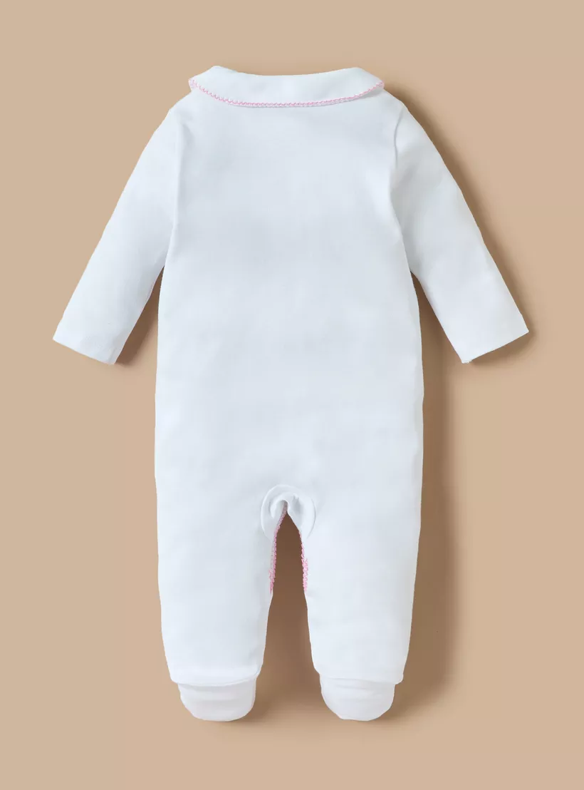 Dress your little one in ultimate comfort with this charming sleepsuit. Crafted from soft cotton, it ensures a peaceful slumber for your baby. The floral embroidery and crisp tone give a radiant visual appeal, while the collared neck and long sleeves add a touch of sophistication. It is finished with snap button fastening and a closed-feet pattern.
