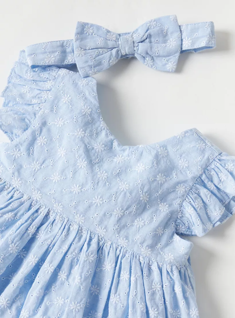 - Bow Detail Headband: A matching headband with an adorable bow detail complements the dress, adding a touch of playful elegance and completing the outfit.