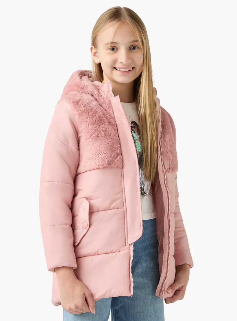 Juniors Quilted Jacket with Faux Fur Hood and Pockets