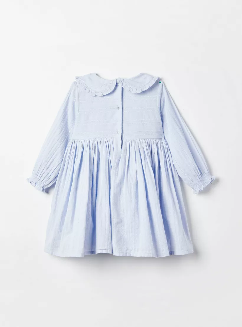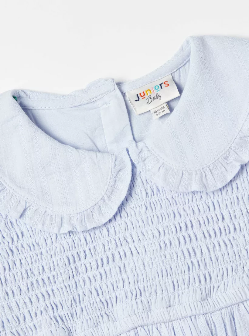This classic dress by Juniors is a lovely choice for your baby girl. It is enhanced by a shirred front bodice and is well-tailored from breathable, soft cotton fabric. The key features are the Peter Pan collar, long sleeves, cinched waist and button closure at the back. This modest dress promises lasting comfort and is easy to wash.