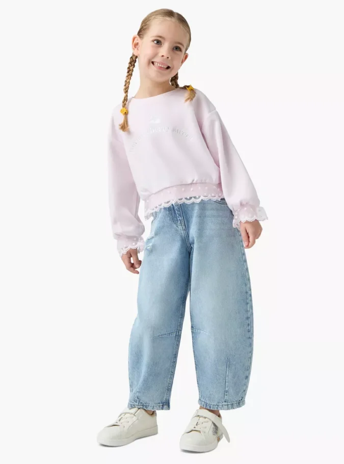 Keep your little one cozy and stylish with the Juniors Slogan Embroidered Sweatshirt with Lace Detail and Long Sleeves. This sweatshirt combines comfort with trendy detailing, making it a perfect pick for everyday wear. The embroidered slogan adds a playful touch, while delicate lace trims bring a hint of charm and uniqueness. Designed with soft fabric and a relaxed fit, it ensures all-day comfort whether at school, playdates, or family outings.