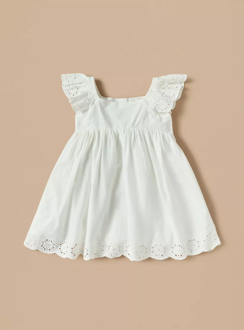 Crafted from soft and breathable cotton, this dress with matching bloomers will keep your baby girl comfortable all day long. The A-line silhouette provides ample room for movement, while the square neckline and ruffle sleeves make it easy to wear. The dress is adorned with delicate schiffli embroidery and a scalloped hem, adding a touch of charm to her outfit.