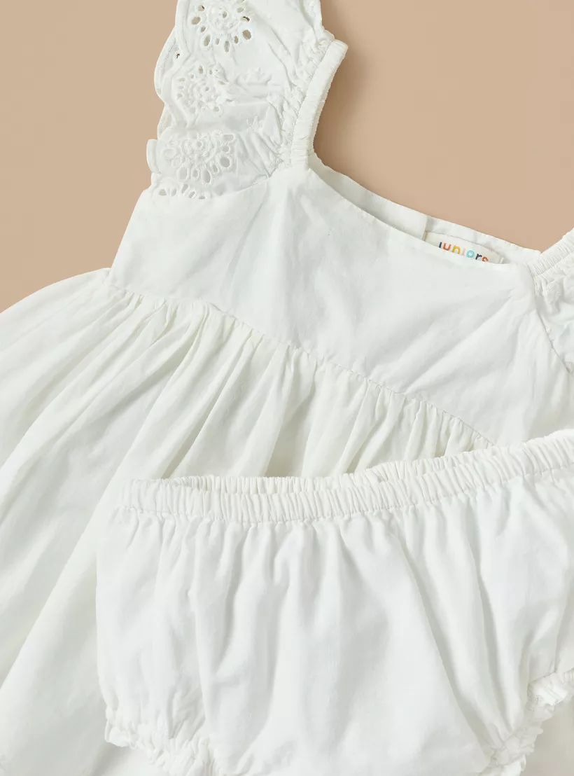 Juniors Solid Schiffli Detail A-line Dress with Ruffle Detail and Elasticated Bloomers