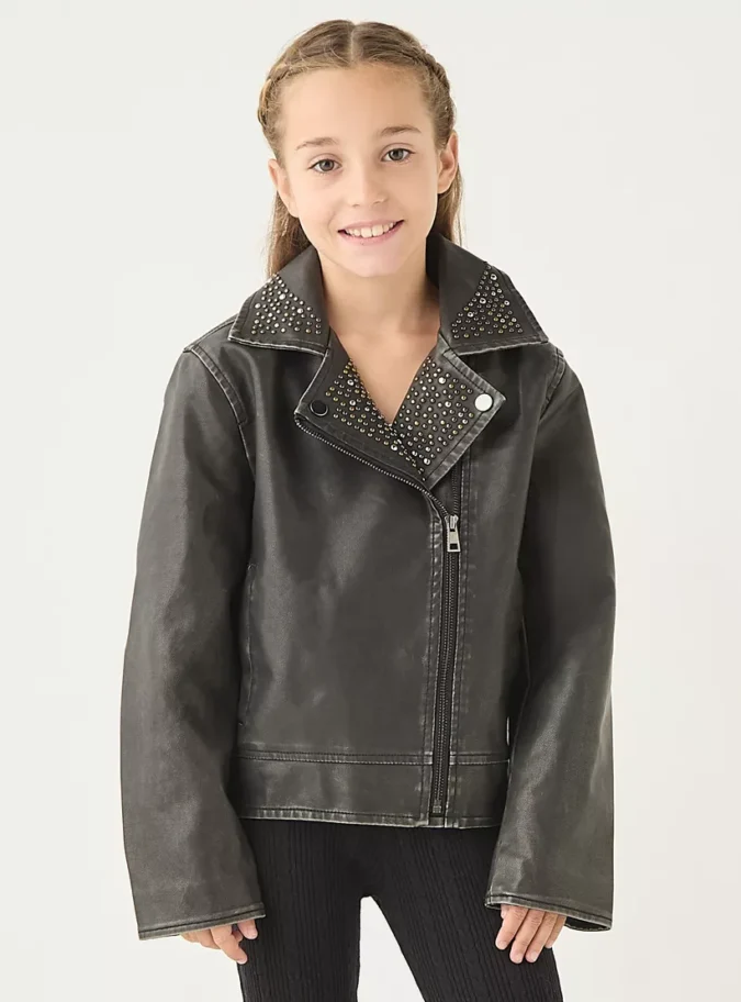 Give your young fashionista a bold edge with the Juniors Studded Pleather Jacket with Long Sleeves. Crafted from premium faux leather, this jacket blends trendy design with everyday comfort. The eye-catching studded detailing adds a rock-chic vibe, making it a perfect layering piece for school, casual outings, or weekend adventures. Designed to keep juniors stylish and confident, this jacket offers the right mix of durability, flair, and attitude.