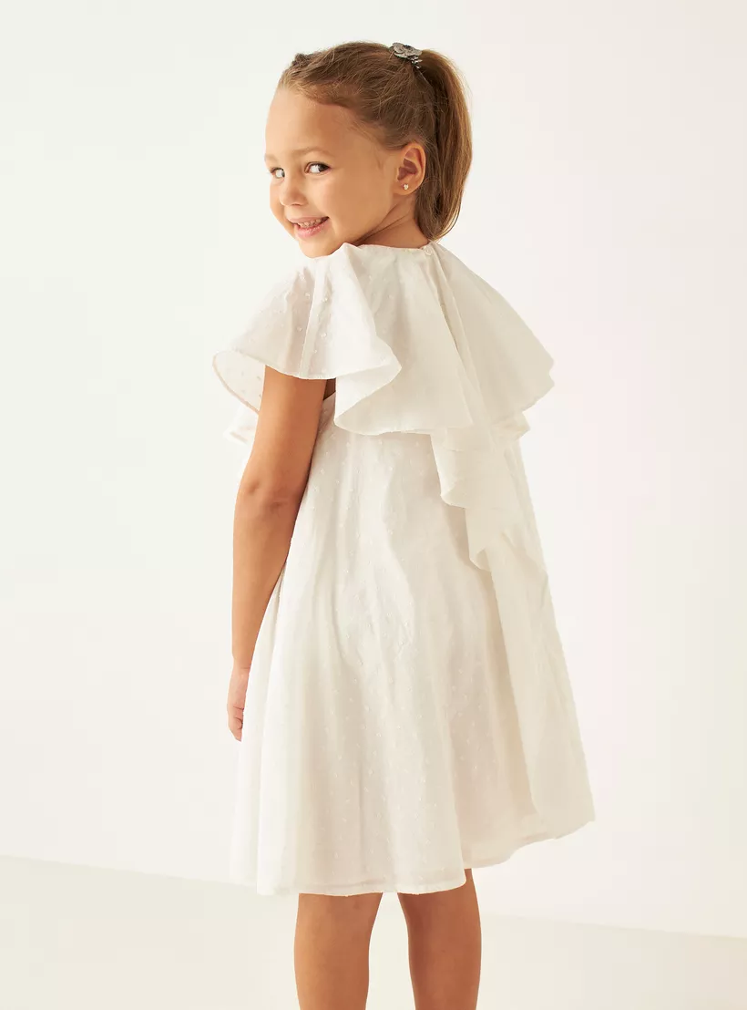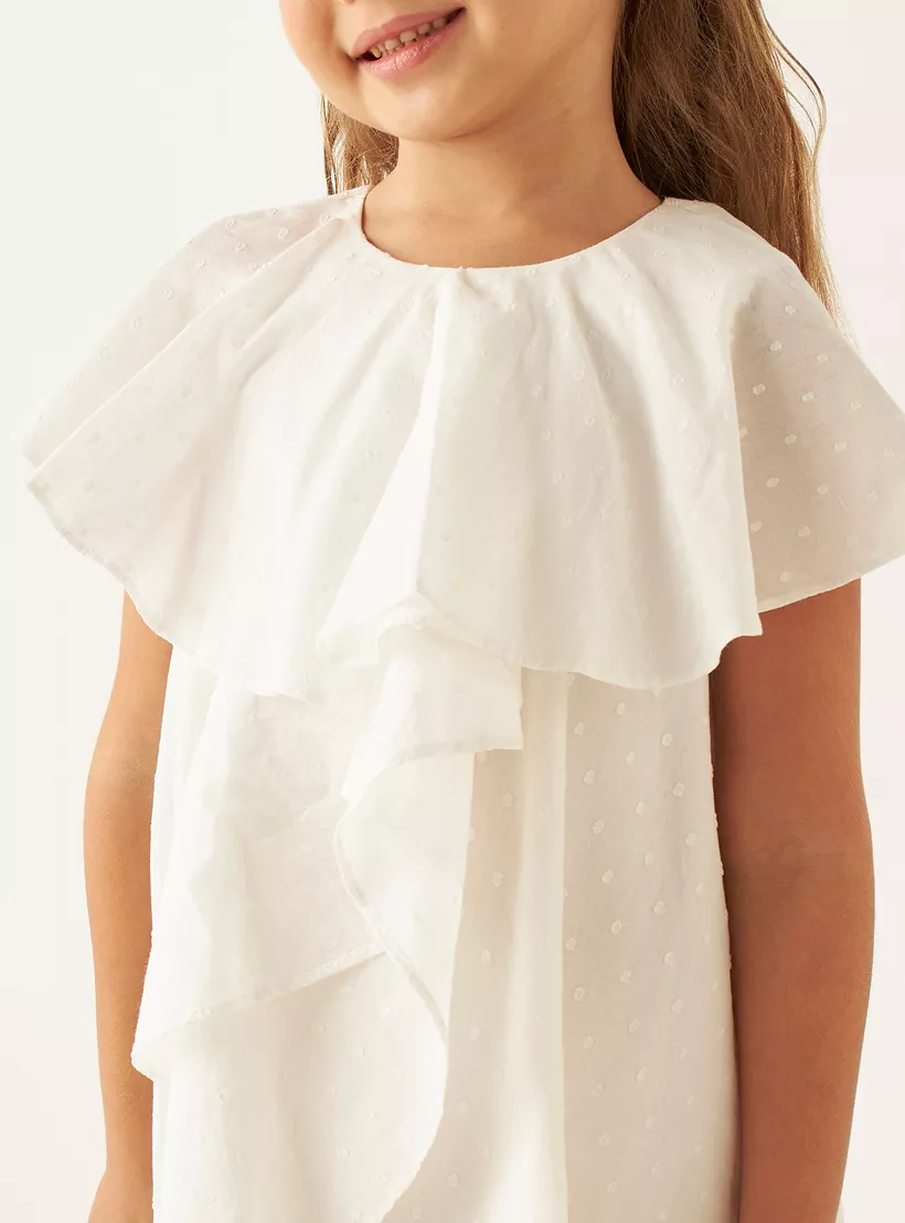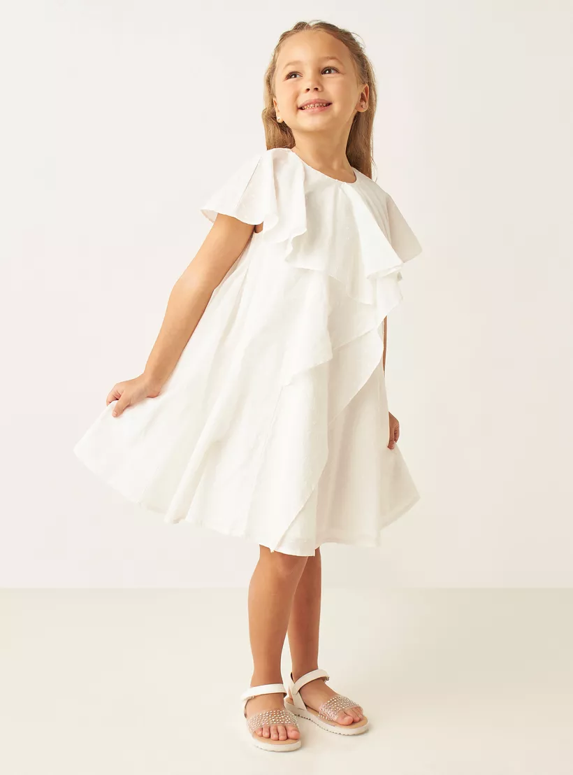 This dress is perfect for a special occasion. The textured material and ruffle detail adds a touch of sophistication, while the short sleeves keep her cool and comfortable. She can wear this dress with sandals for an effortlessly breezy ensemble.