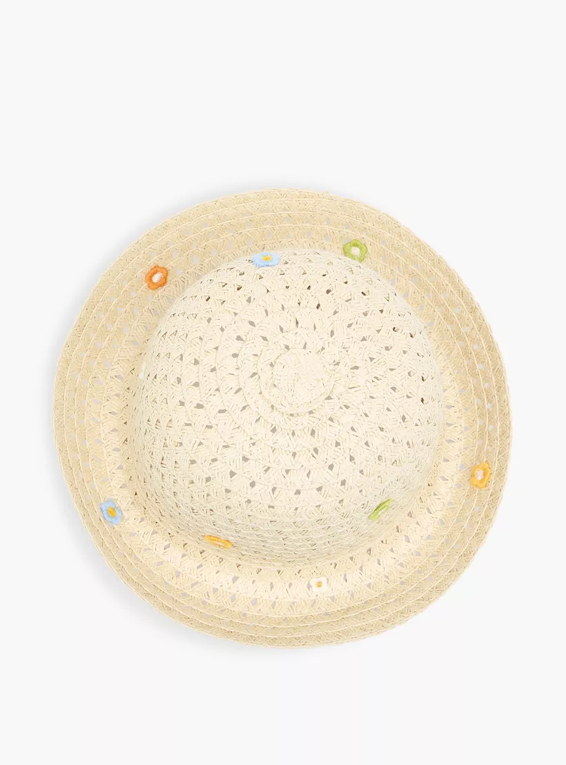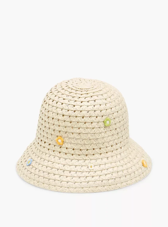 • Features a large, decorative flower, often in a contrasting color or material, sewn securely to the front or side. This applique is the defining decorative element, giving the hat its distinctive, feminine character.