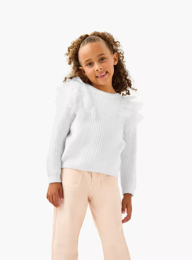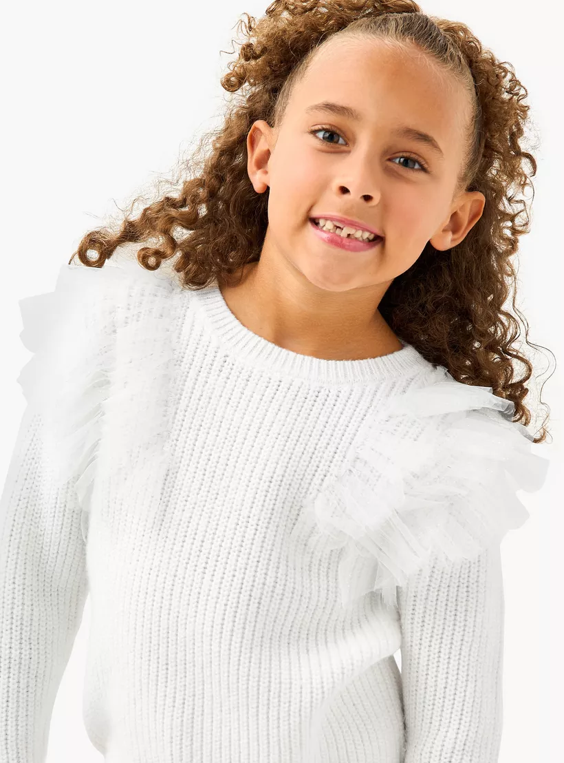 Keep your little one cozy and stylish with this Juniors Textured Sweater with Long Sleeves and Tulle Detail. Designed with a soft textured knit, it blends warmth with a playful charm. The delicate tulle accents add a touch of elegance, making it perfect for both casual outings and special occasions. Comfortable, trendy, and easy to pair, this sweater is a must-have addition to your child’s winter wardrobe.