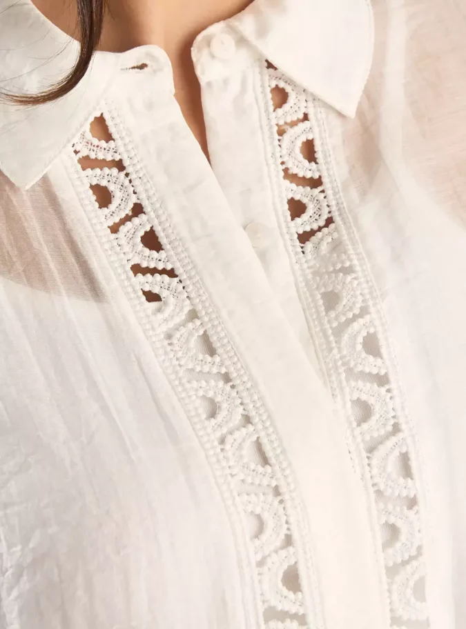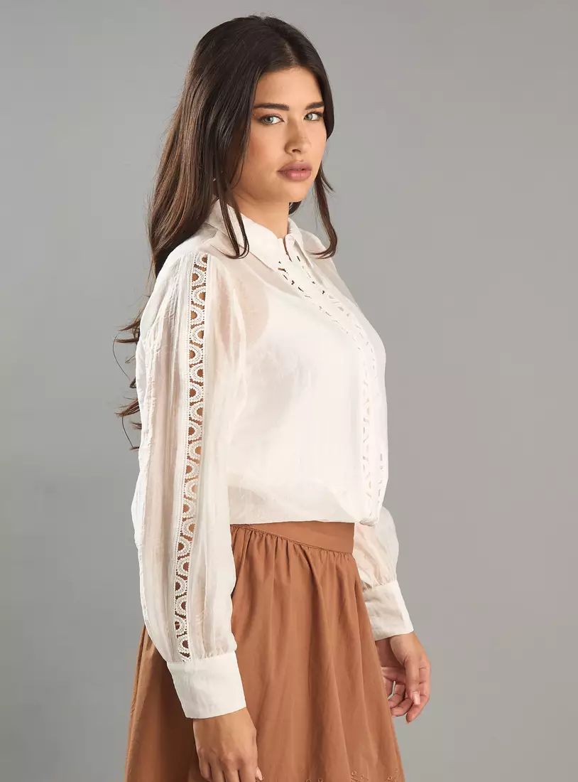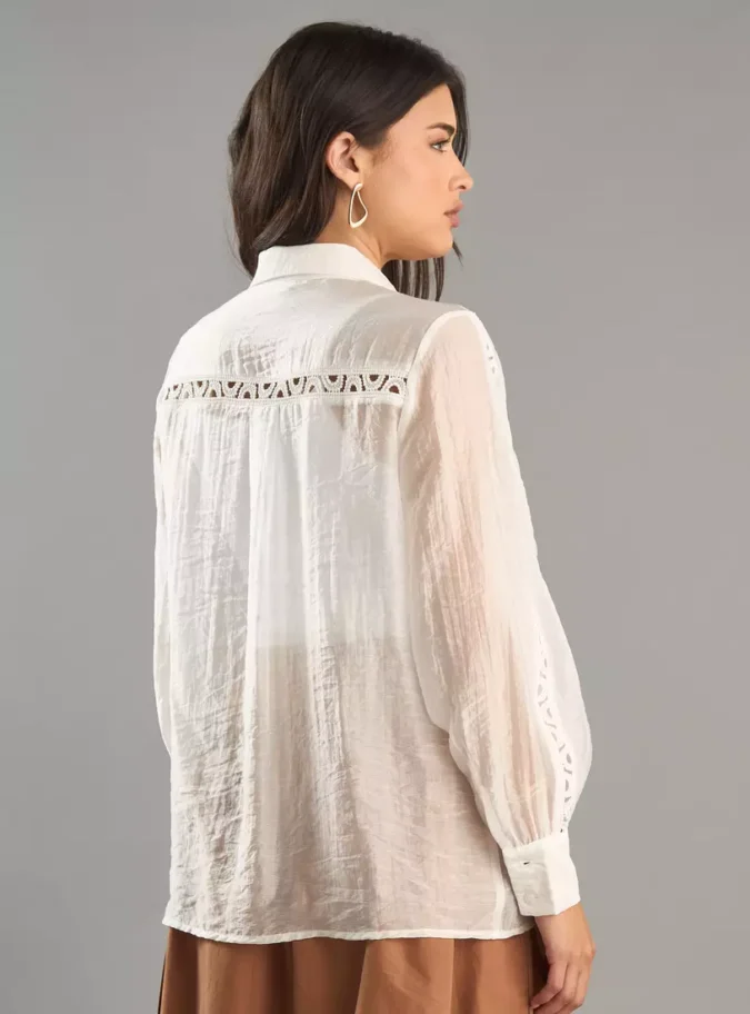 Play of Sheerness & Opacity: This shirt masterfully balances see-through and covered elements. The voile is often semi-sheer, while the lace inserts are more openly transparent. This creates a “peek-a-boo” effect that is alluring without being overt.