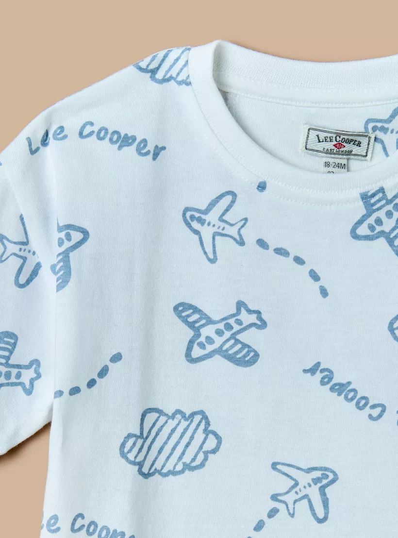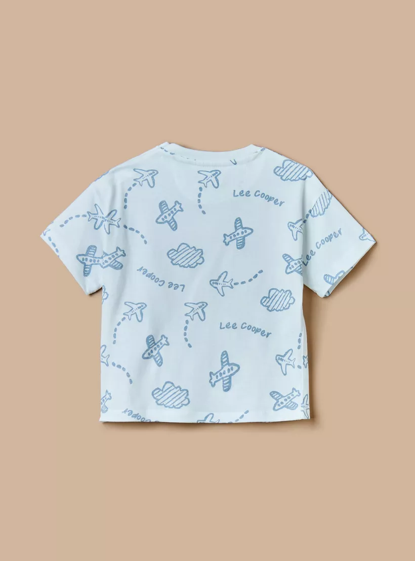 Lee Cooper All-Over Airplane Print T-shirt with Short Sleeves and Crew Neck