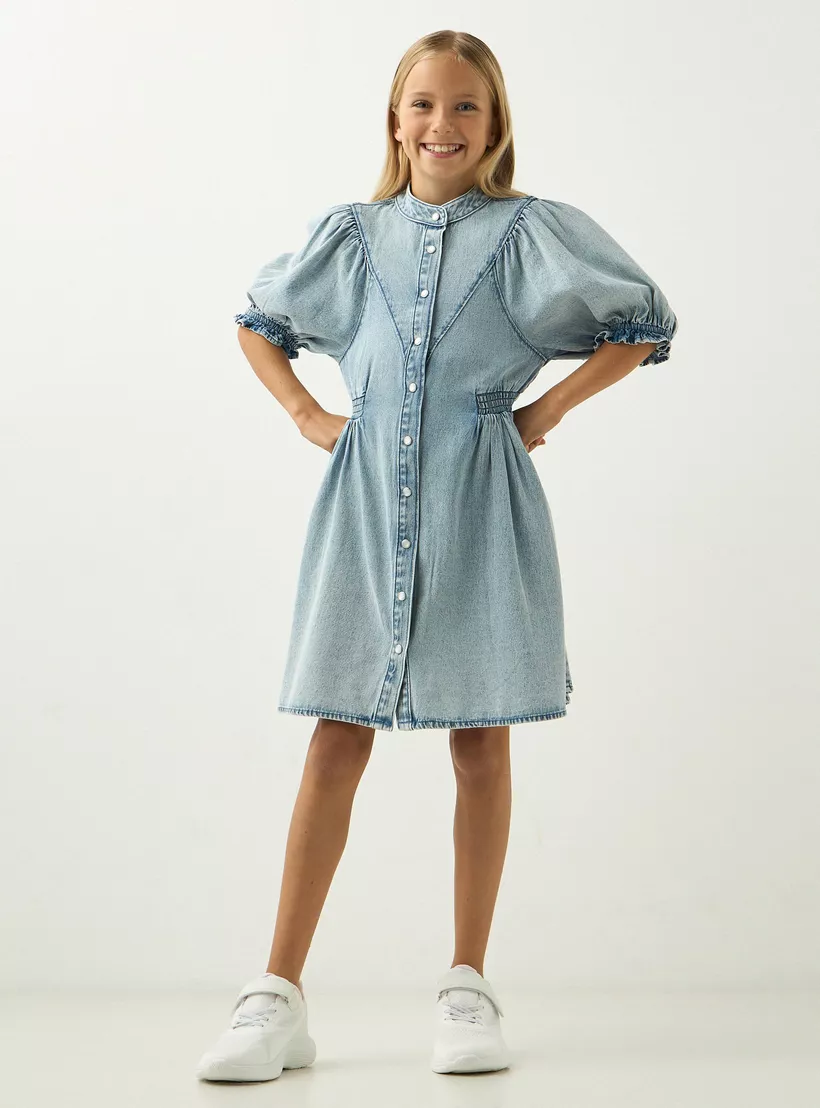 Lee Cooper Textured Mandarin Collar Dress with Puff Sleeves