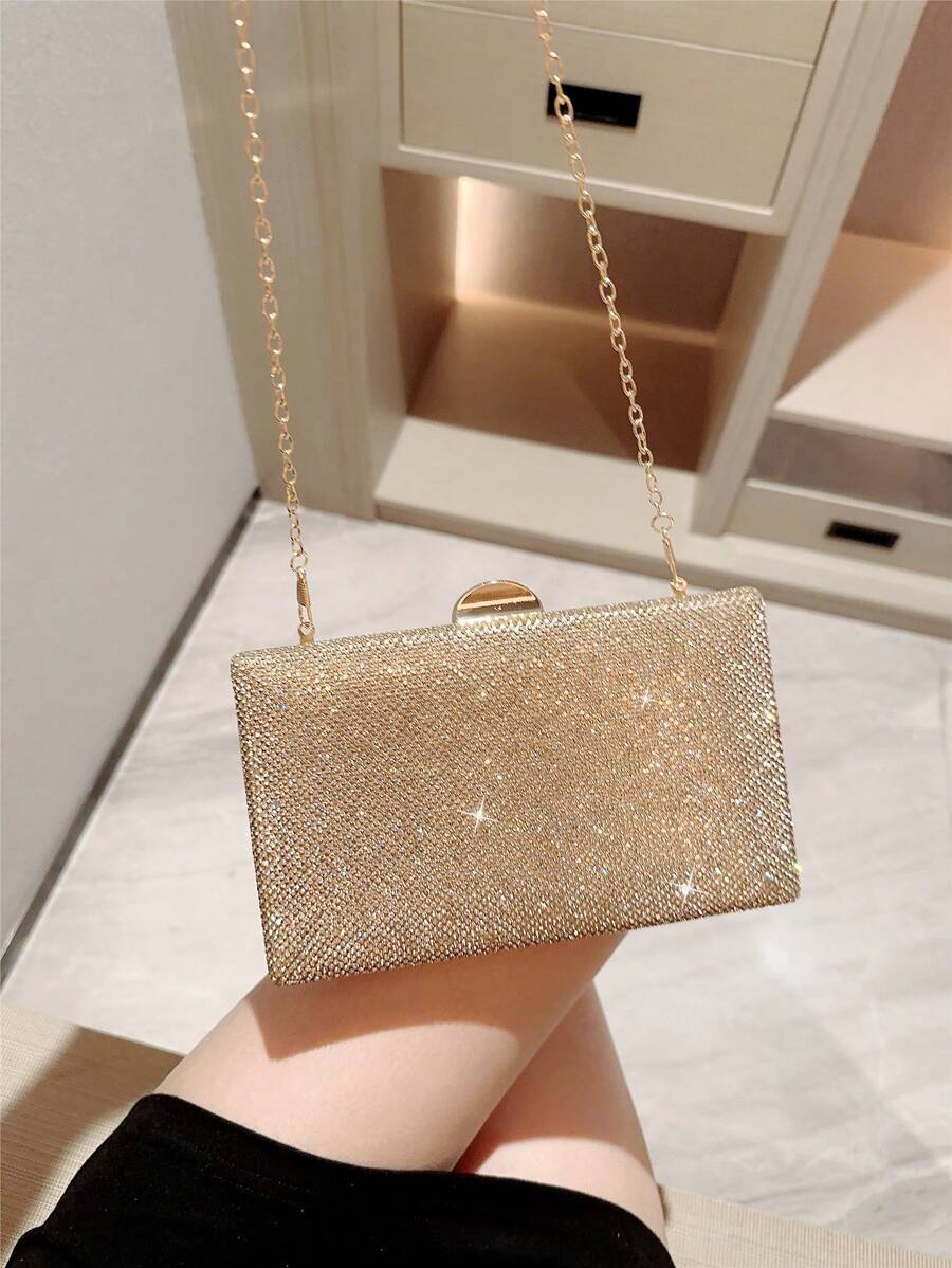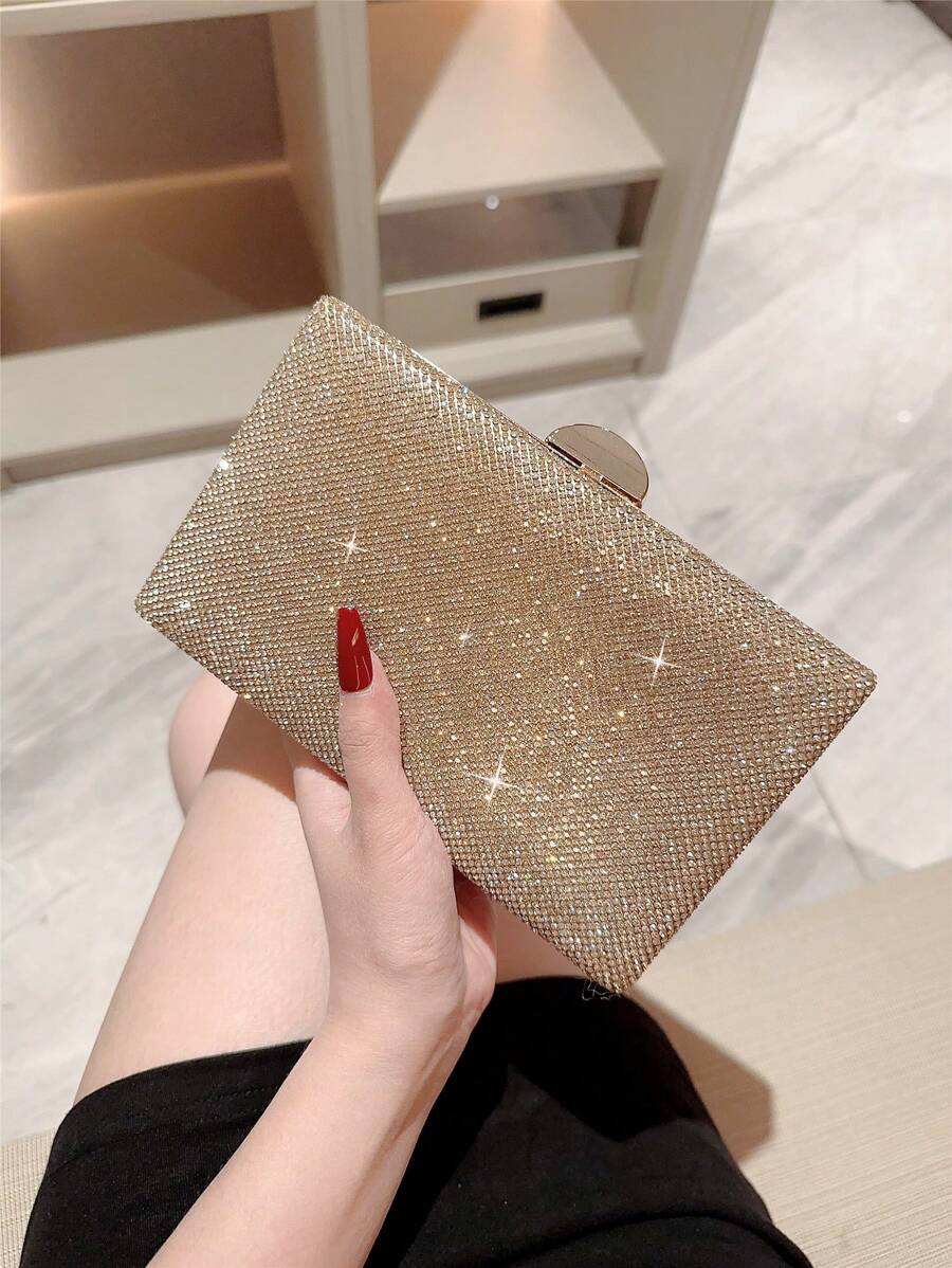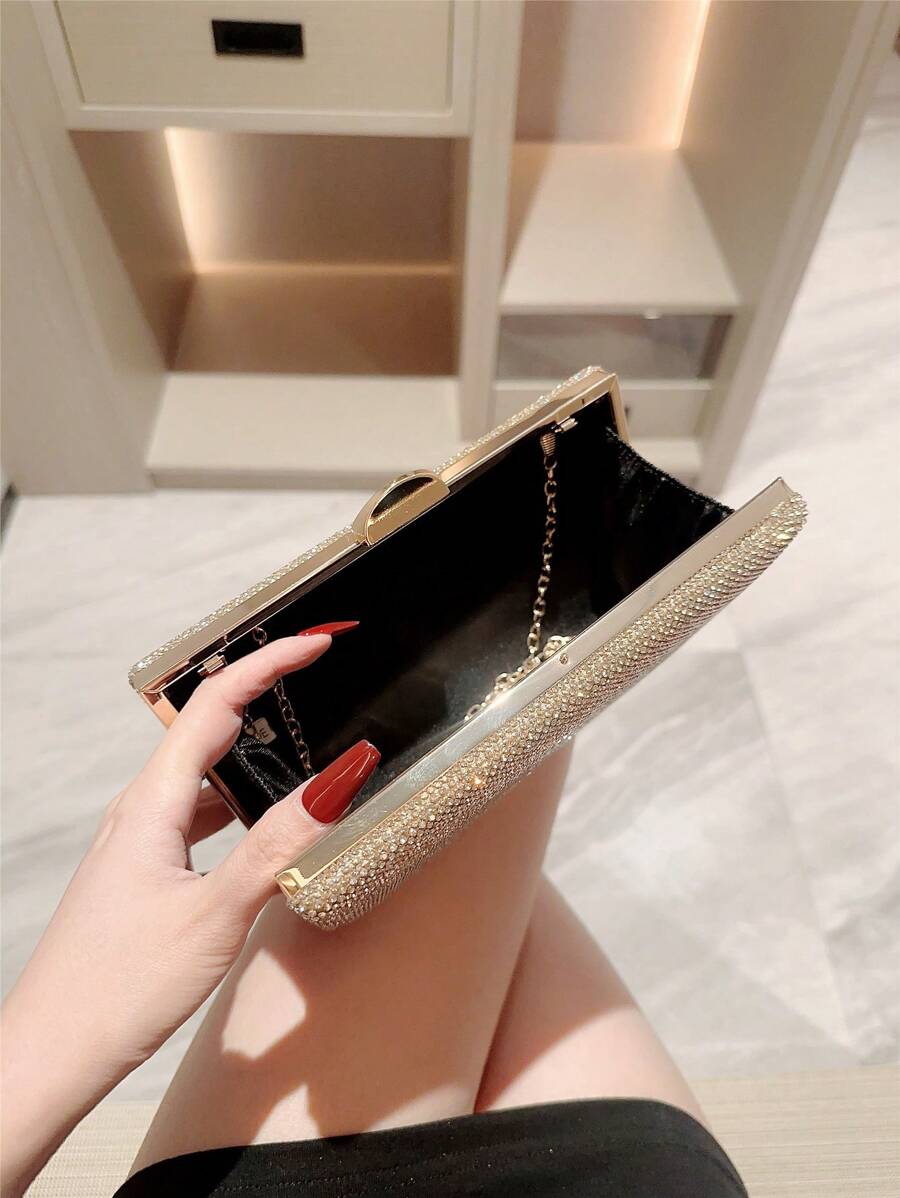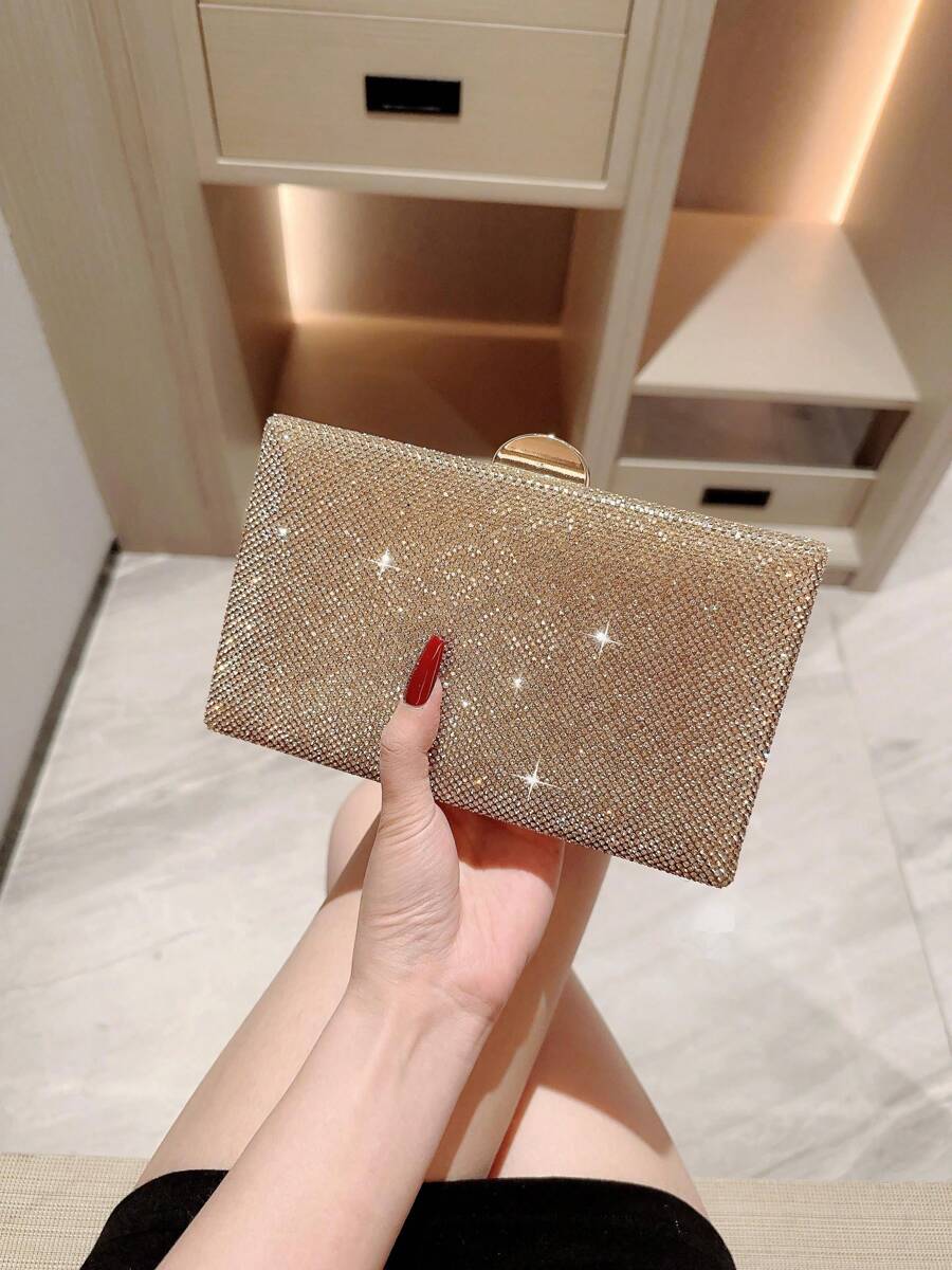 Make a dazzling statement with the Luxury Sparkling Rhinestone Evening Bag, a stunning accessory designed for unforgettable moments. With its box-shaped silhouette and shimmering rhinestone exterior, this elegant clutch effortlessly blends romance and glamour. The radiant gold tone adds a touch of luxury, making it the perfect companion for weddings, formal events, or evening parties. Whether you’re the bride or a guest, this eye-catching bag complements your look with grace and sophistication.