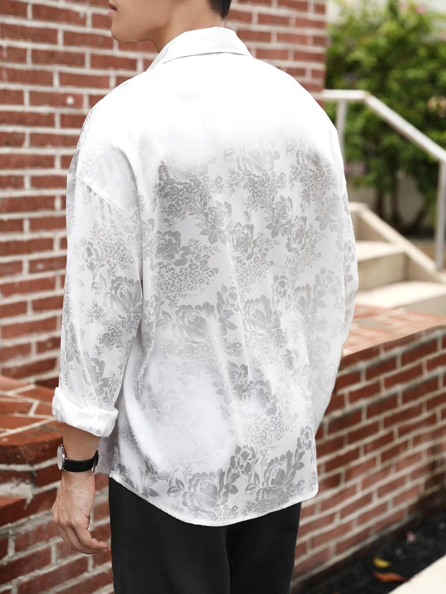 Manfinity Hypemode Oversized Men’s Floral Jacquard Button Front Shirt, Baggy Long Sleeve Plain White Casual Shirt For Boyfriend Gift