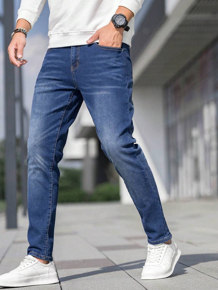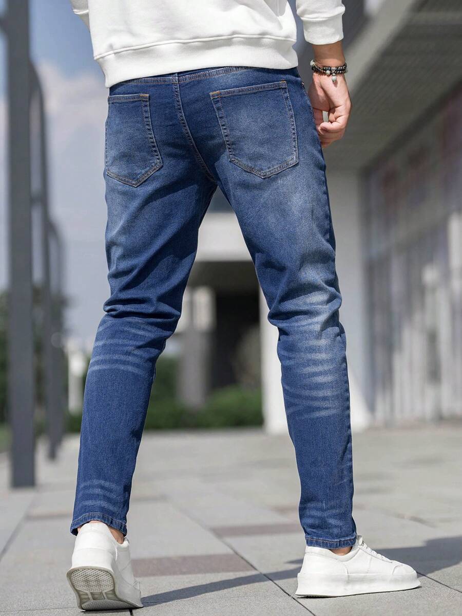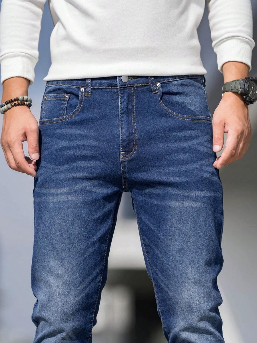 Manfinity Men Slant Pocket Skinny Jeans, Plain Dark Blue Slim Fit Dark Jeans