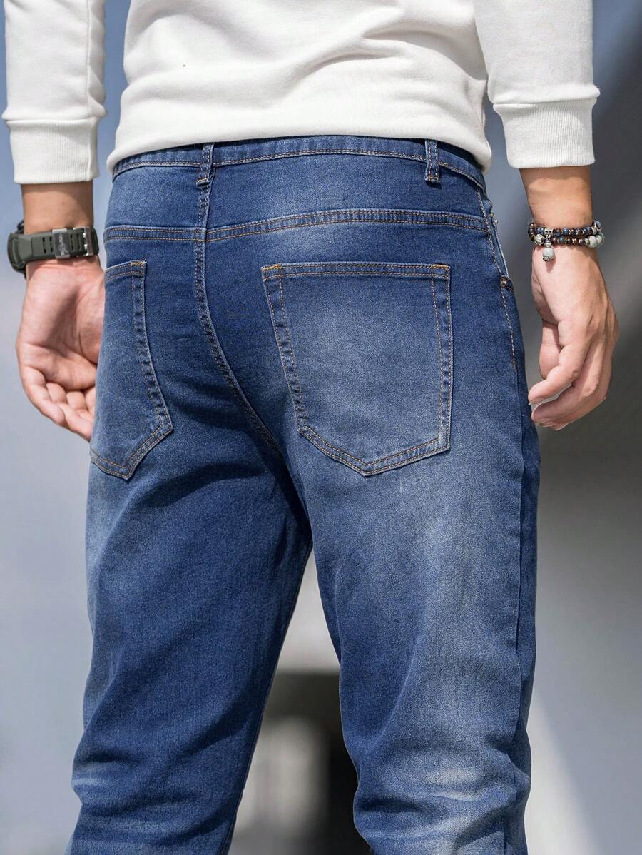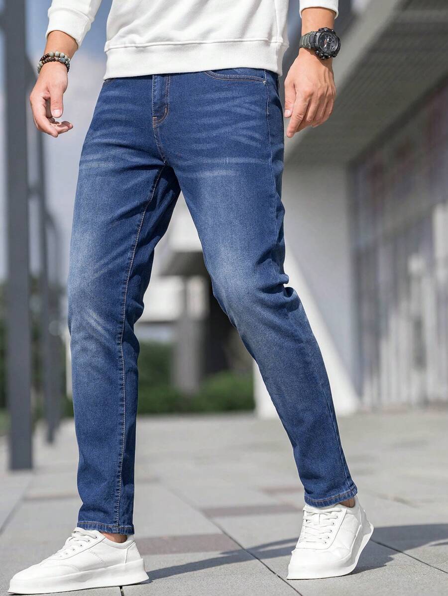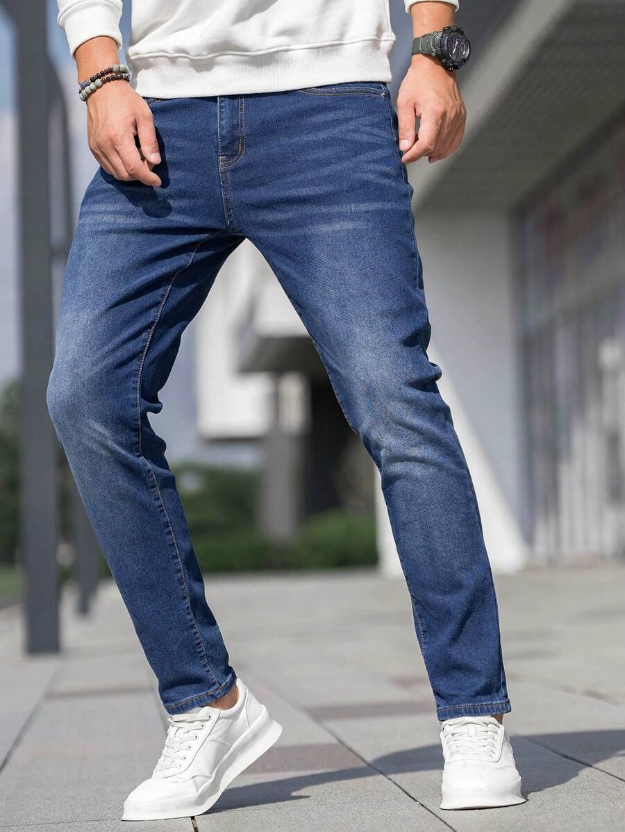 Manfinity Men Slant Pocket Skinny Jeans, Plain Dark Blue Slim Fit Dark Jeans
