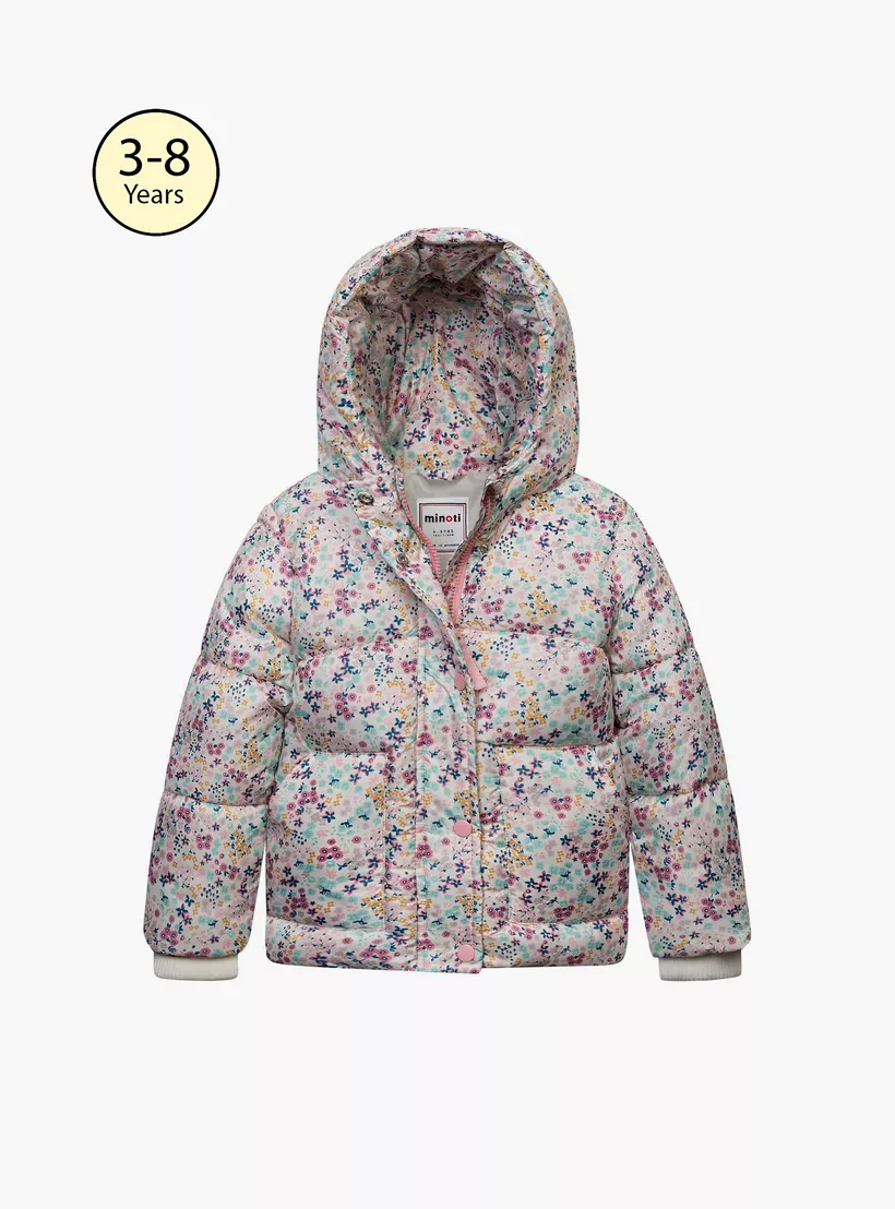 The Minoti Floral Long Printed Sleeves Jacket is a stylish outerwear piece designed for children (girls). It features a full-length sleeve cut, embellished with a vibrant all-over floral print to bring a playful yet fashionable look. The jacket is likely lightweight or mid-weight, suitable for spring or autumn layering. It may include a zip-up or button-front closure, and possibly a soft lining or finishing for comfort. The hem would typically hit at the hip or slightly below, offering modest coverage without bulkiness.