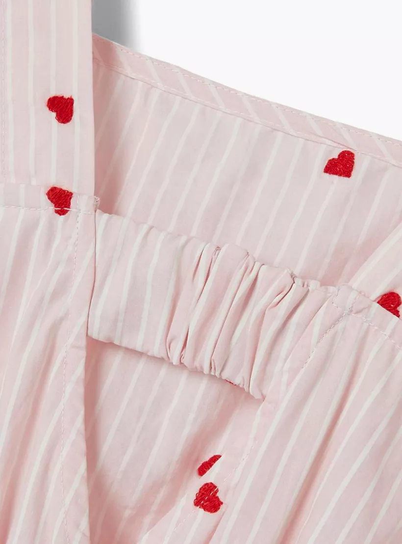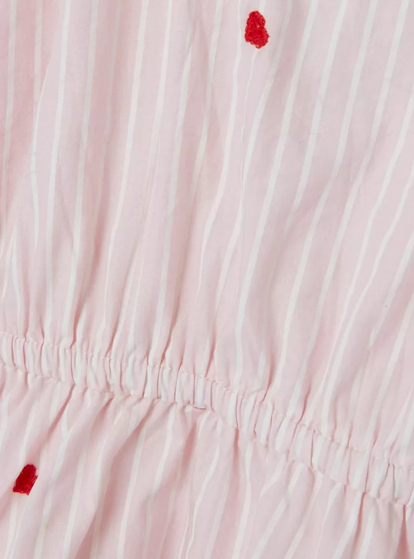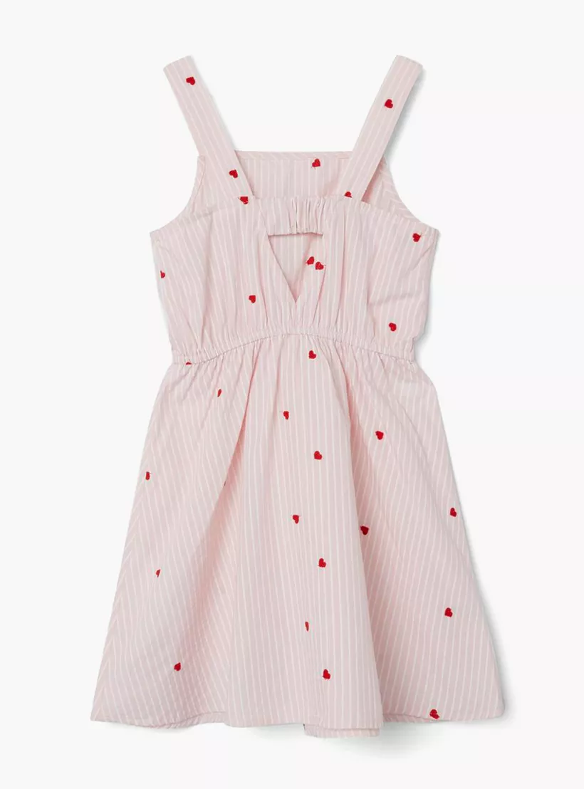 This charming dress is crafted from soft cotton material, providing the utmost comfort for your little girl. Designed for older girls, it is perfect for casual outings. The all-over stripes, heart embroidery and cutout detail enhance its appeal.
