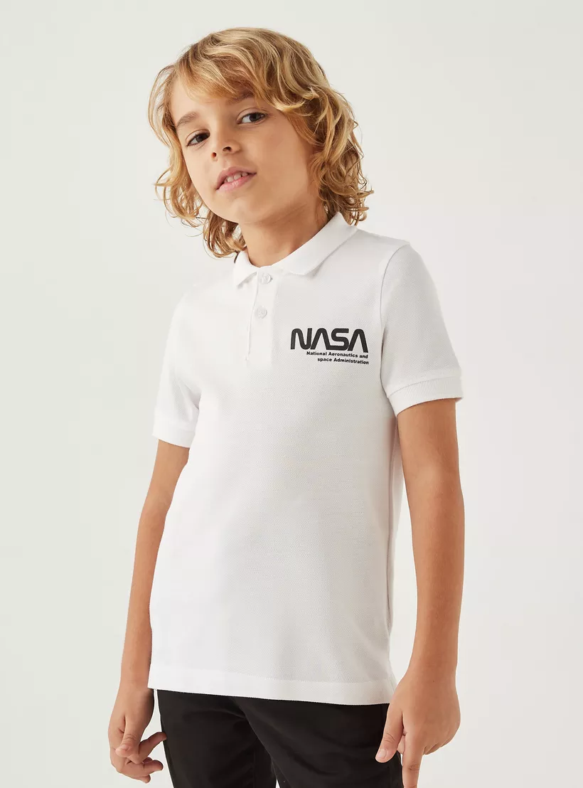 The NASA Print Polo T-shirt features a traditional polo collar with a button-up neckline and short sleeves, offering a relaxed yet polished look. The shirt is adorned with NASA’s iconic “worm” or “meatball” logos, showcasing a tribute to space exploration.
