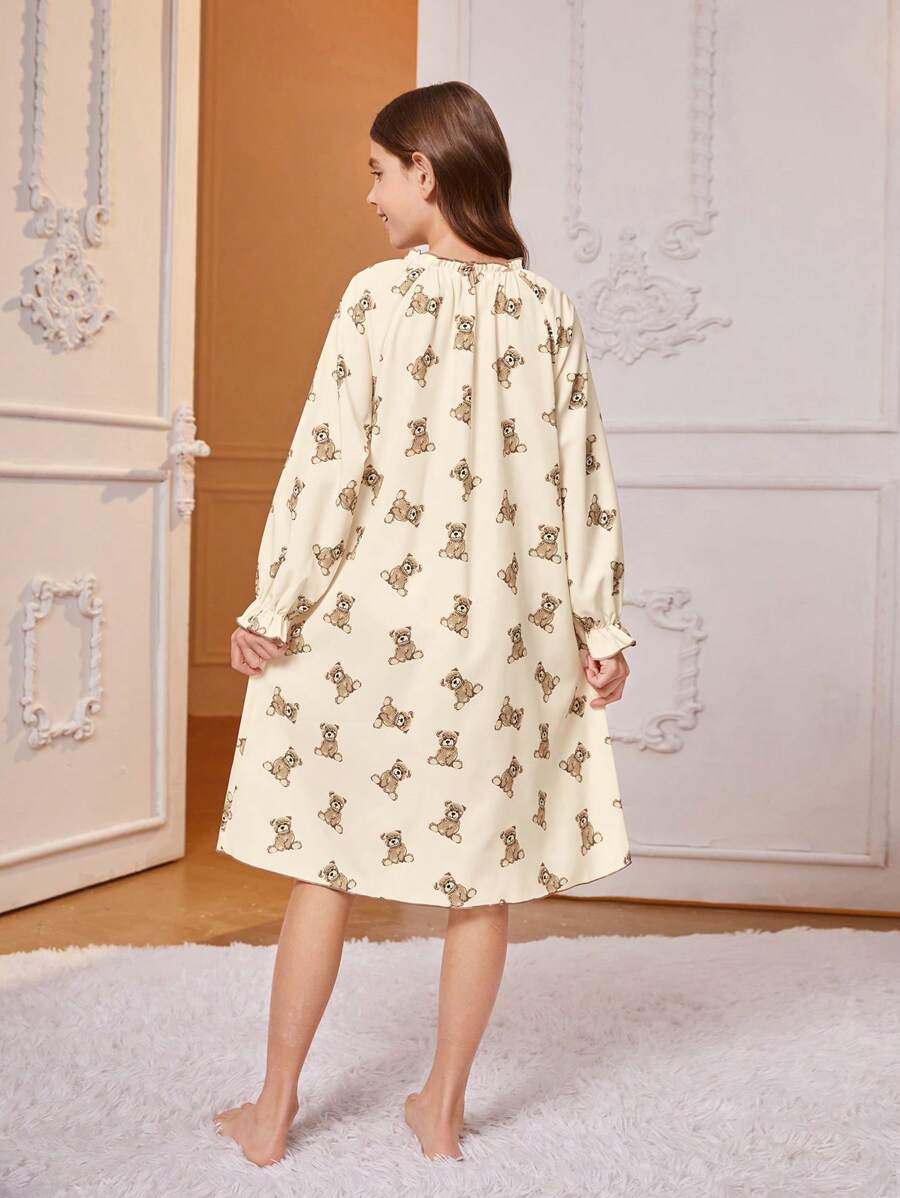 New Arrival Tween Girls’ Cute Bear Printed Long Sleeve Loose Fit Comfortable Sleep Dress
