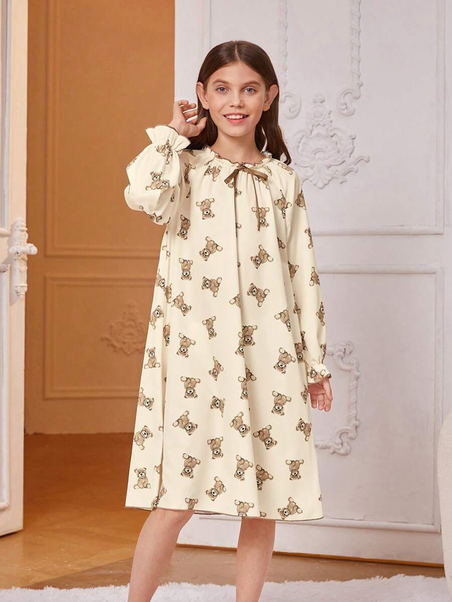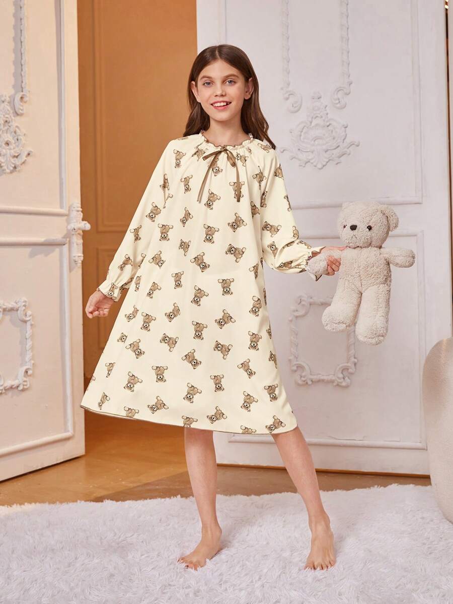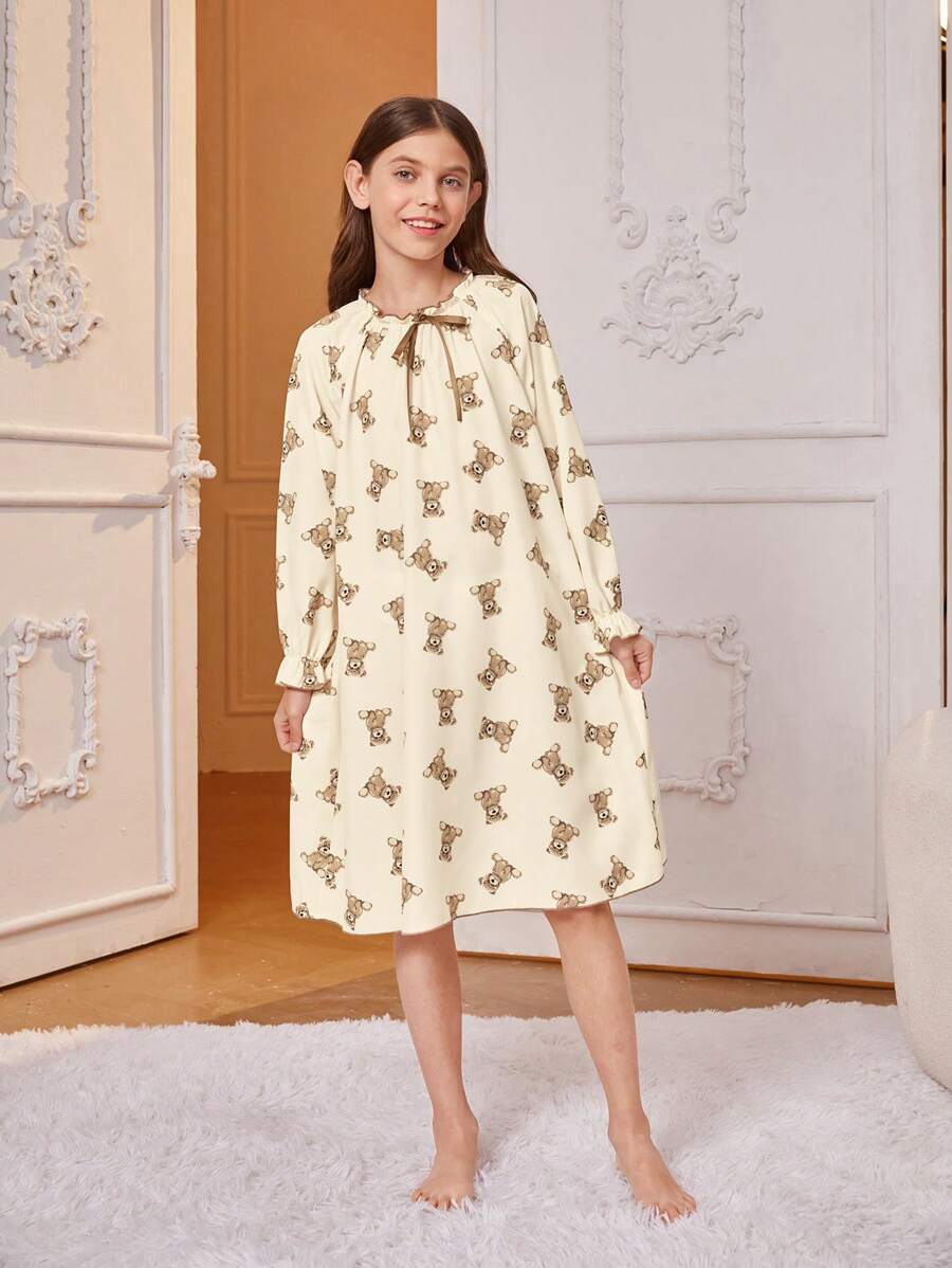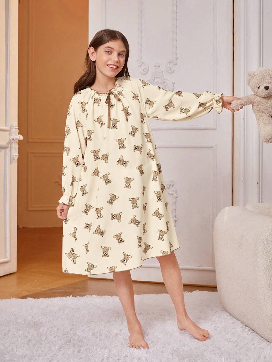 / New Arrival Tween Girls’ Cute Bear Printed Long Sleeve Loose Fit Comfortable Sleep Dress