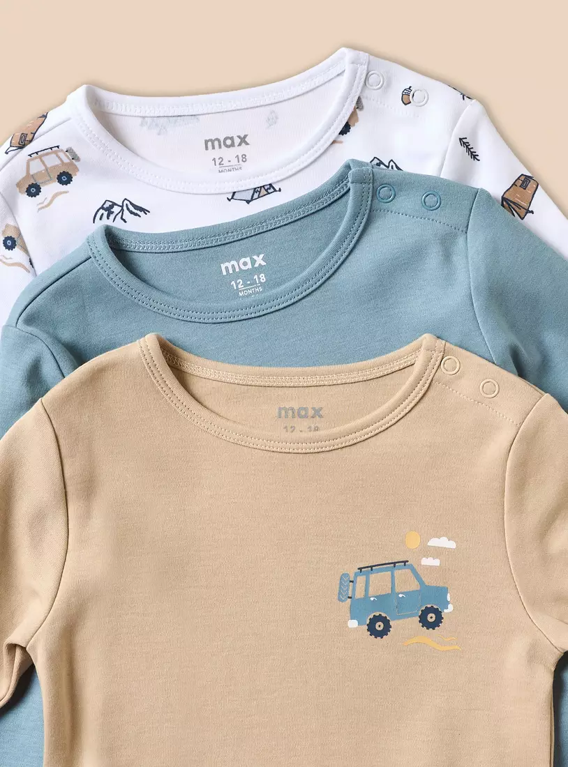 • Set of 3 Bodysuits: Assorted cute prints like animals, shapes, or playful patterns