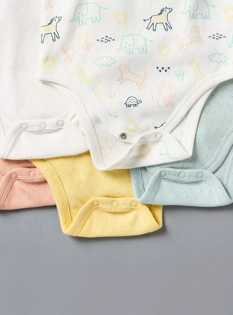 • Set of 5 Bodysuits: Assorted delicate pointelle patterns and colors