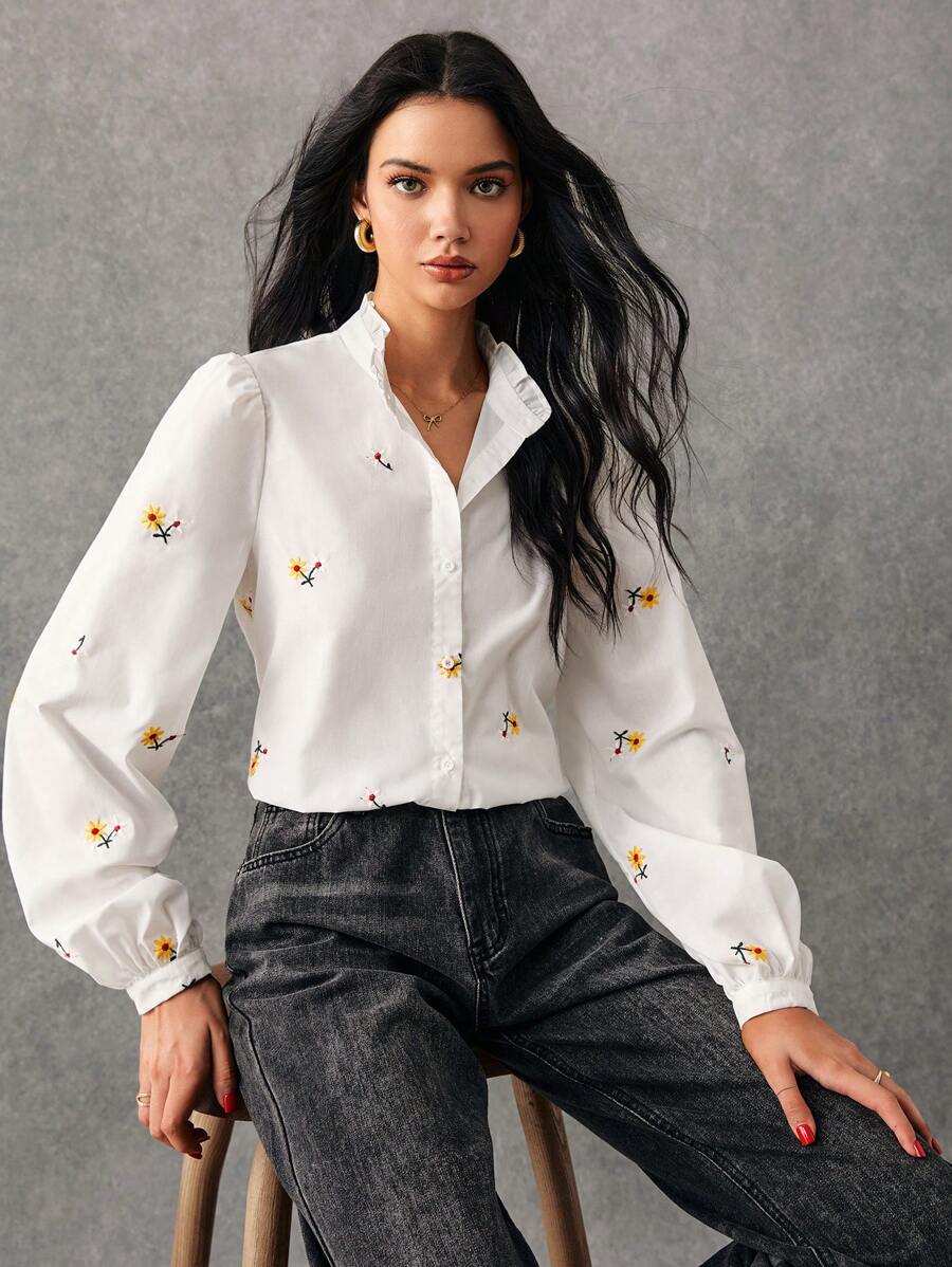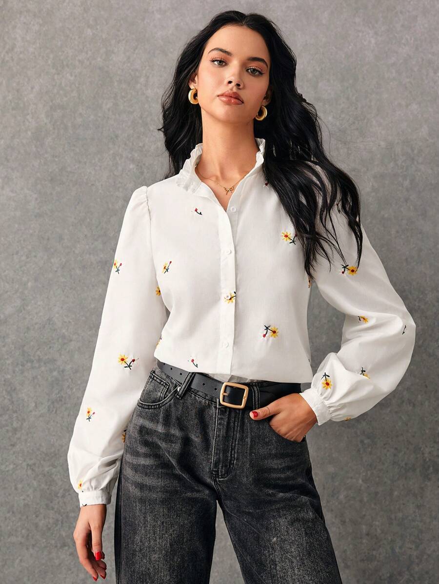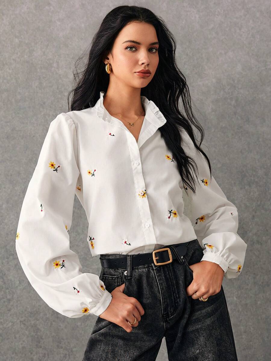 / Poéselle Women Floral Embroidery Button Up Casual Long Sleeve Shirt,Work Shirt,White Shirt