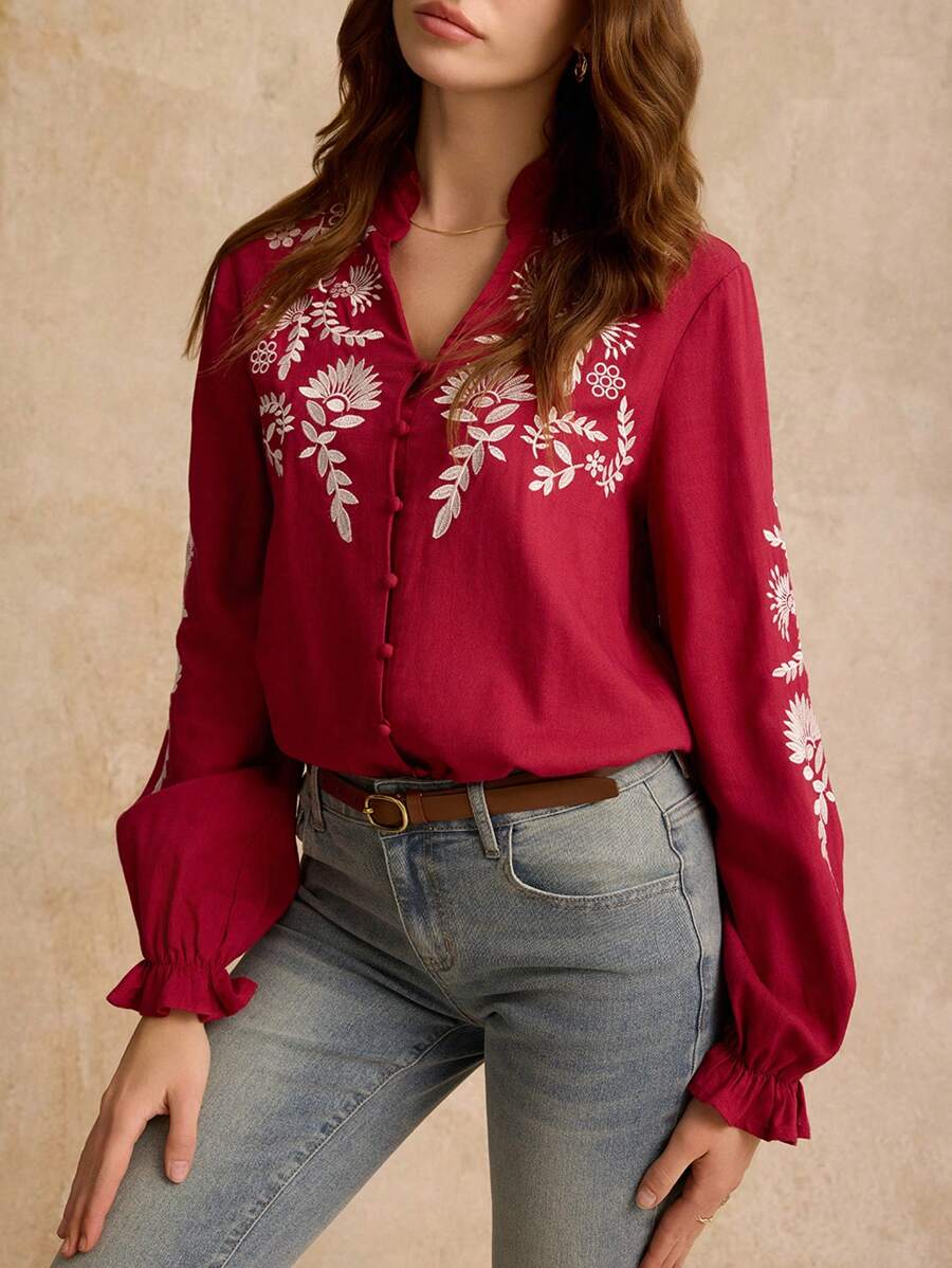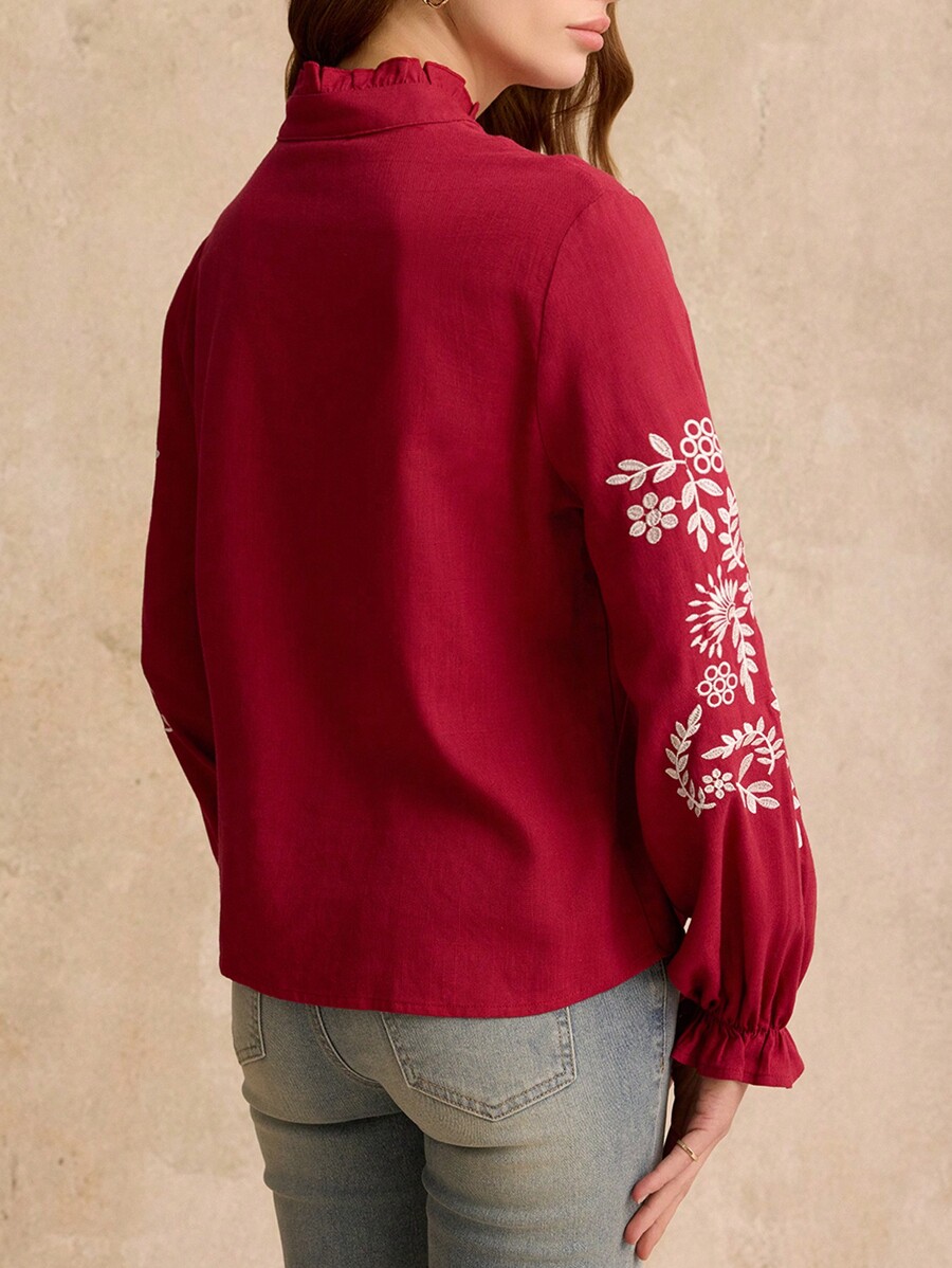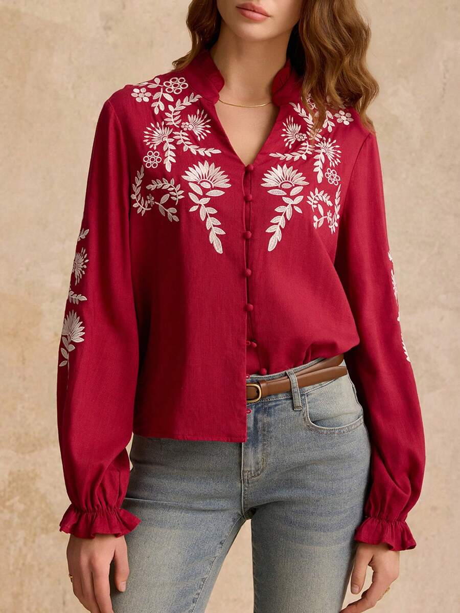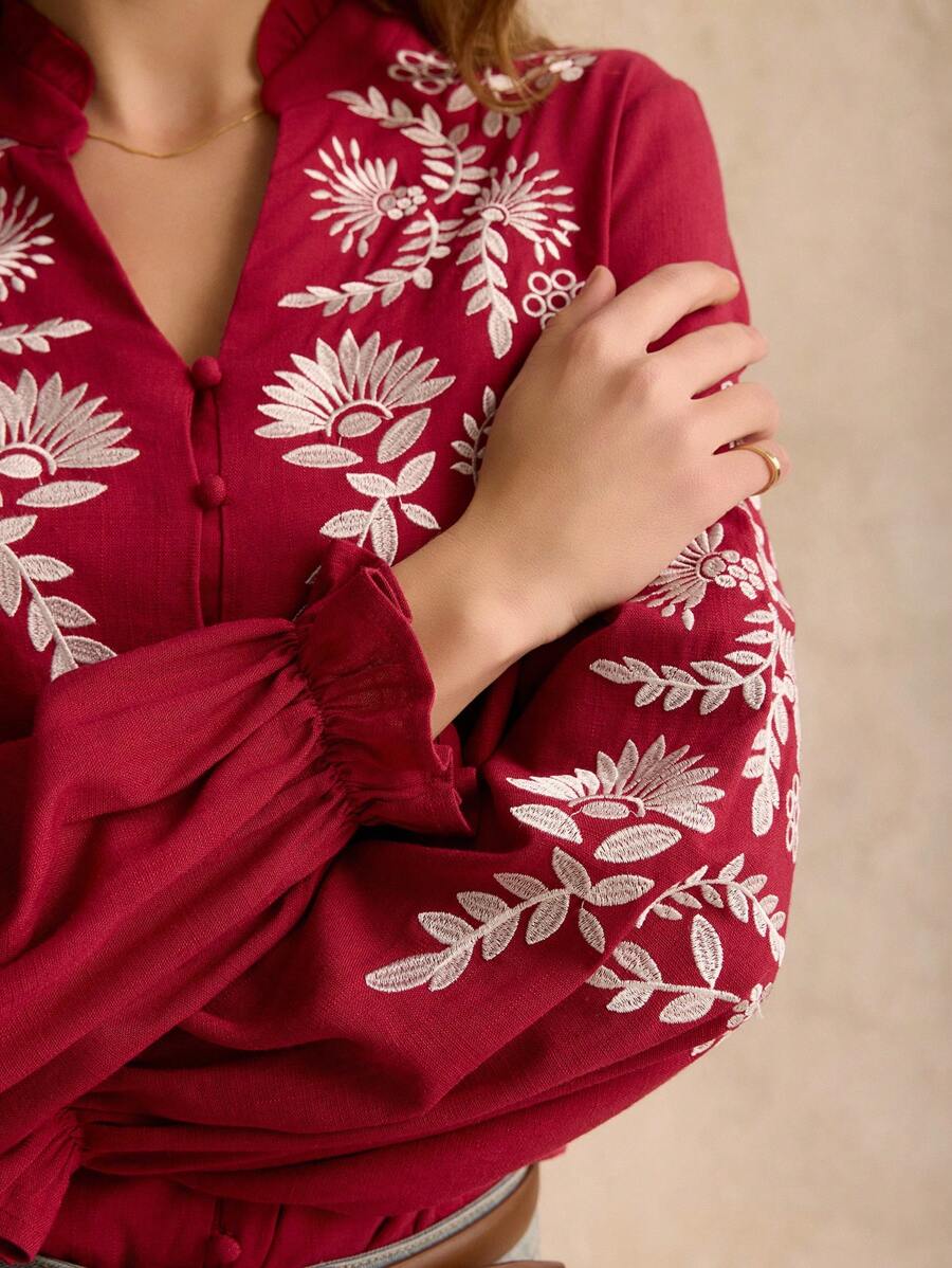 / Poéselle Women’s Burgundy Contrast Floral Pattern Full Embroidered Long Sleeve Linen Casual Shirt