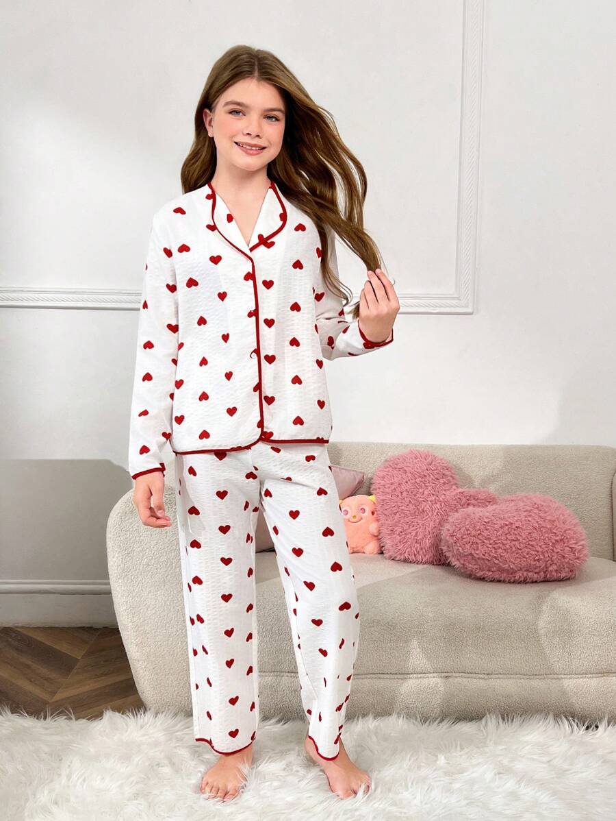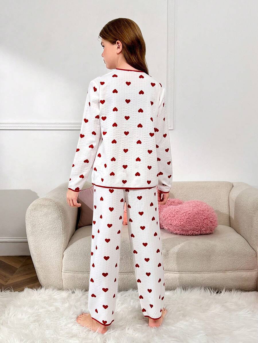 SHEIN 2pcs/Set Tween Girls Graceful Minimalist Red Heart Graphic V-Neck Long Sleeve Top And Straight Leg Contrast Trim Loose Pajama Pants Home Wear