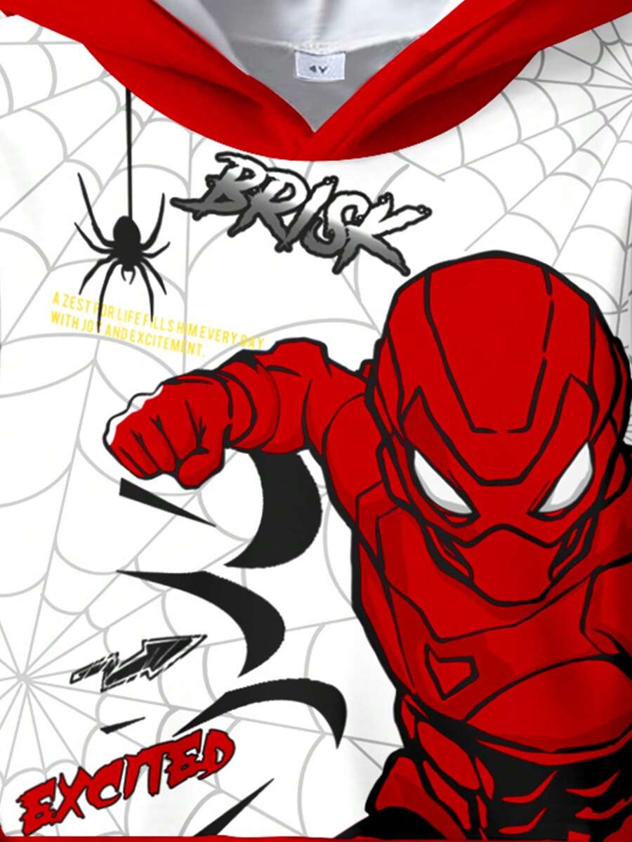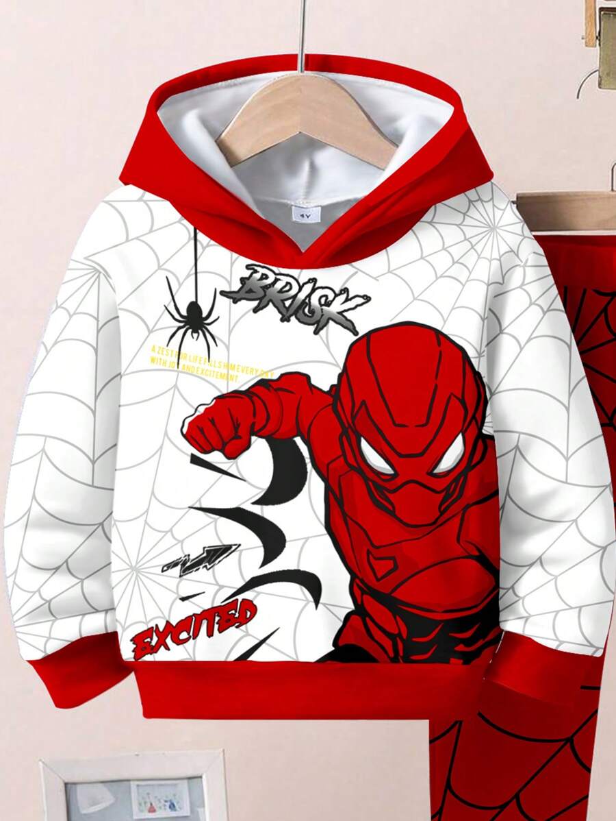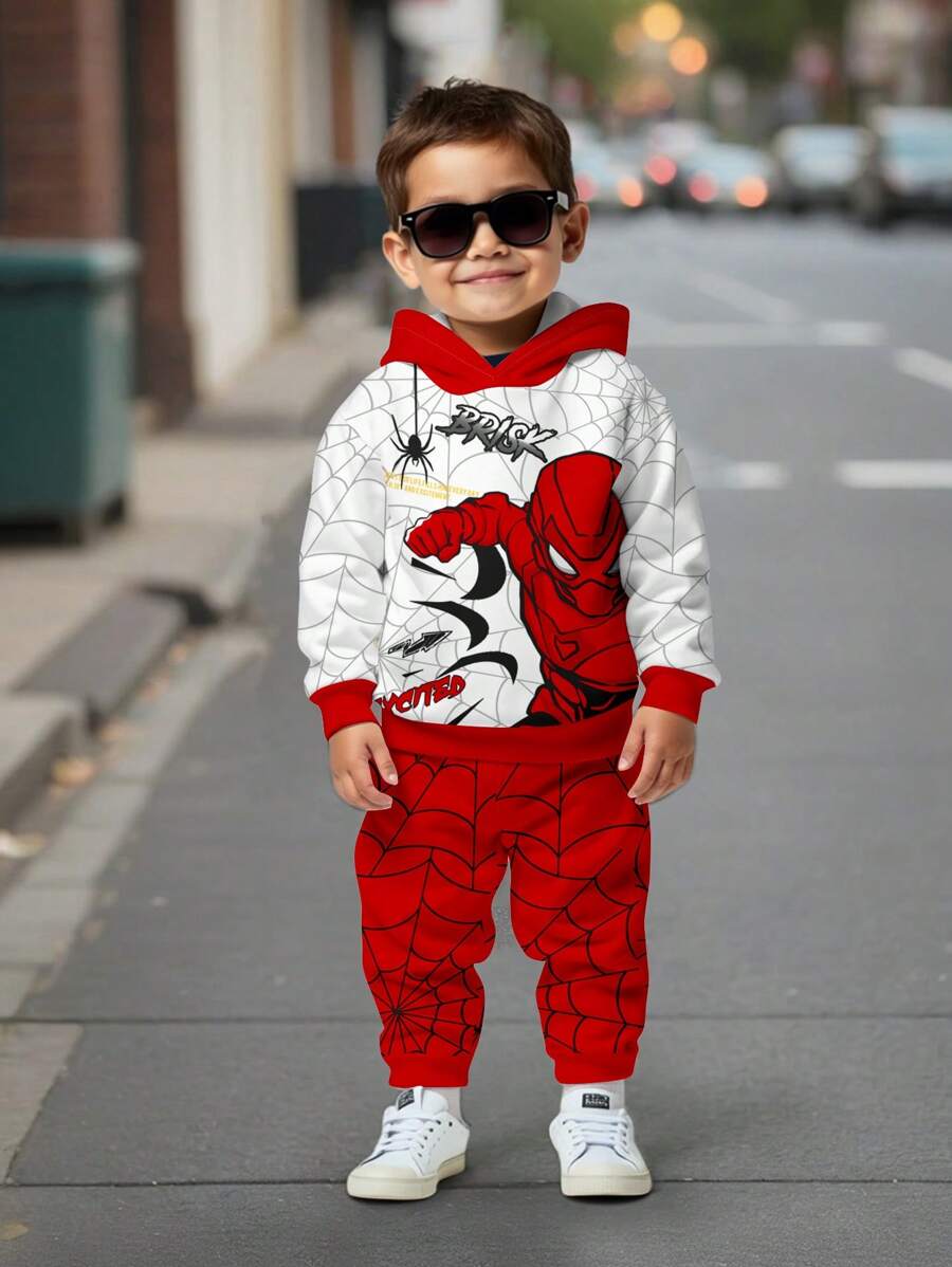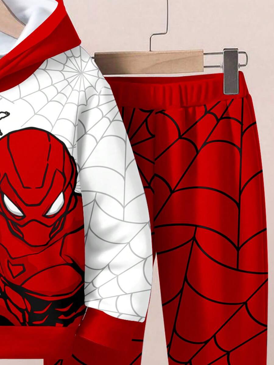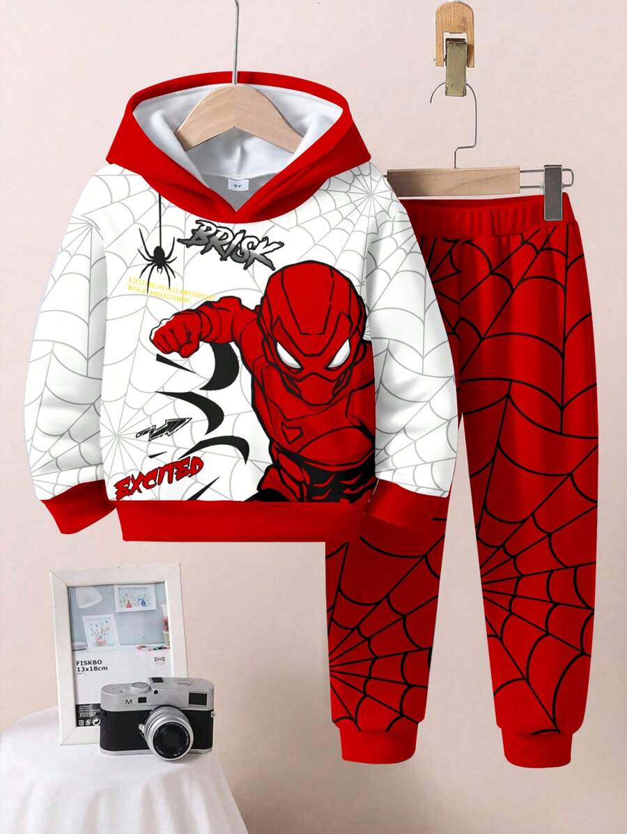 SHEIN 2pcs Young Boy Loose Casual Spider Themed Graphic Print Hoodie & Sweatsuit Set, Comfortable & Fashionable For Autumn/Winter