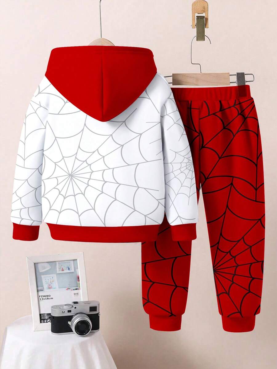 / SHEIN 2pcs Young Boy Loose Casual Spider Themed Graphic Print Hoodie & Sweatsuit Set, Comfortable & Fashionable For Autumn/Winter