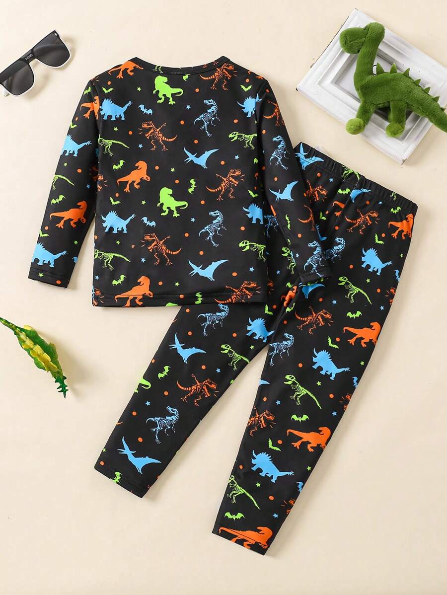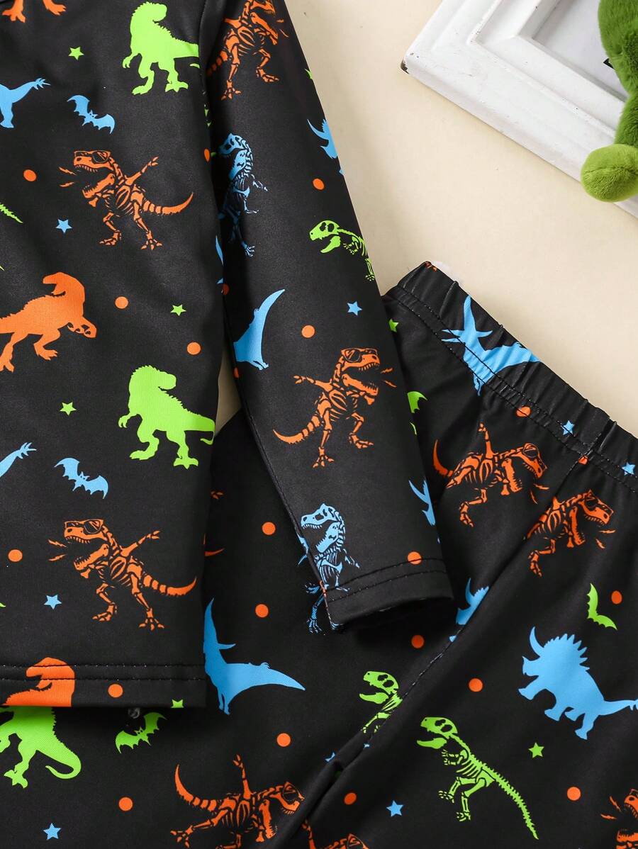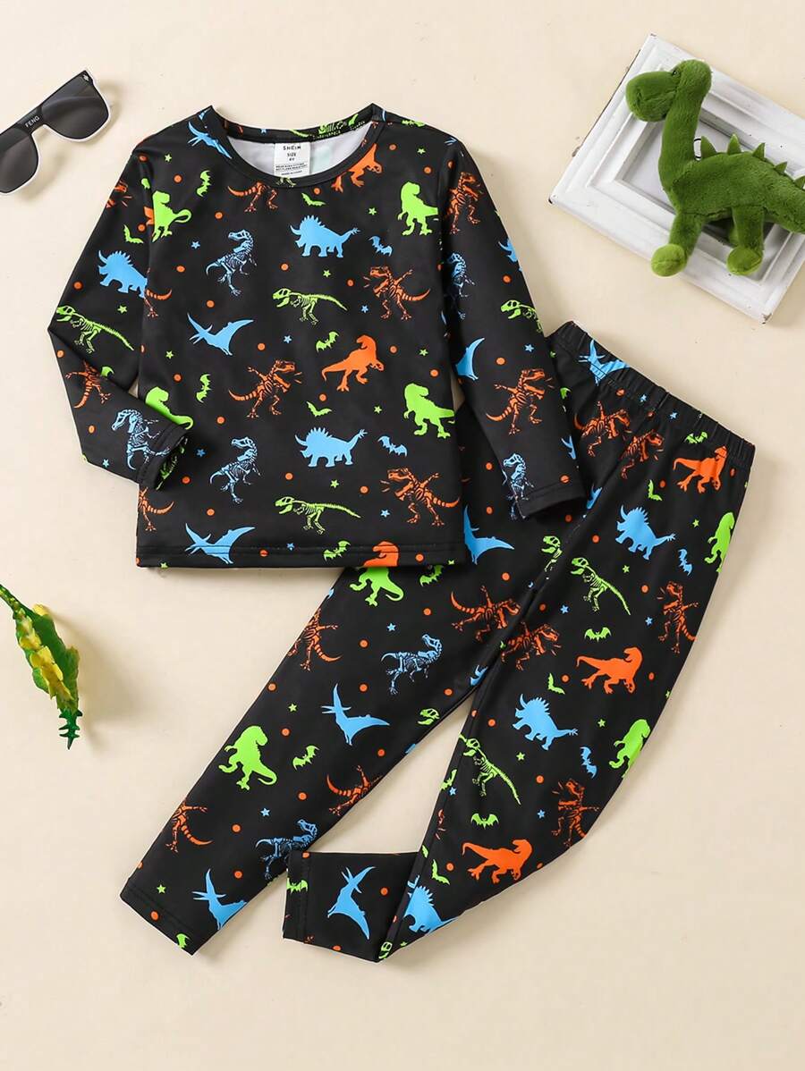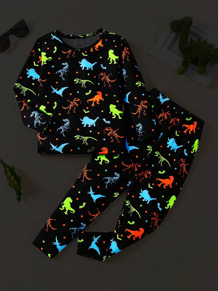 SHEIN 2pcs Young Boy Snug Fit Glow-In-The-Dark Dinosaur Print Long Sleeve Top And Pants Knitted Pajama Set